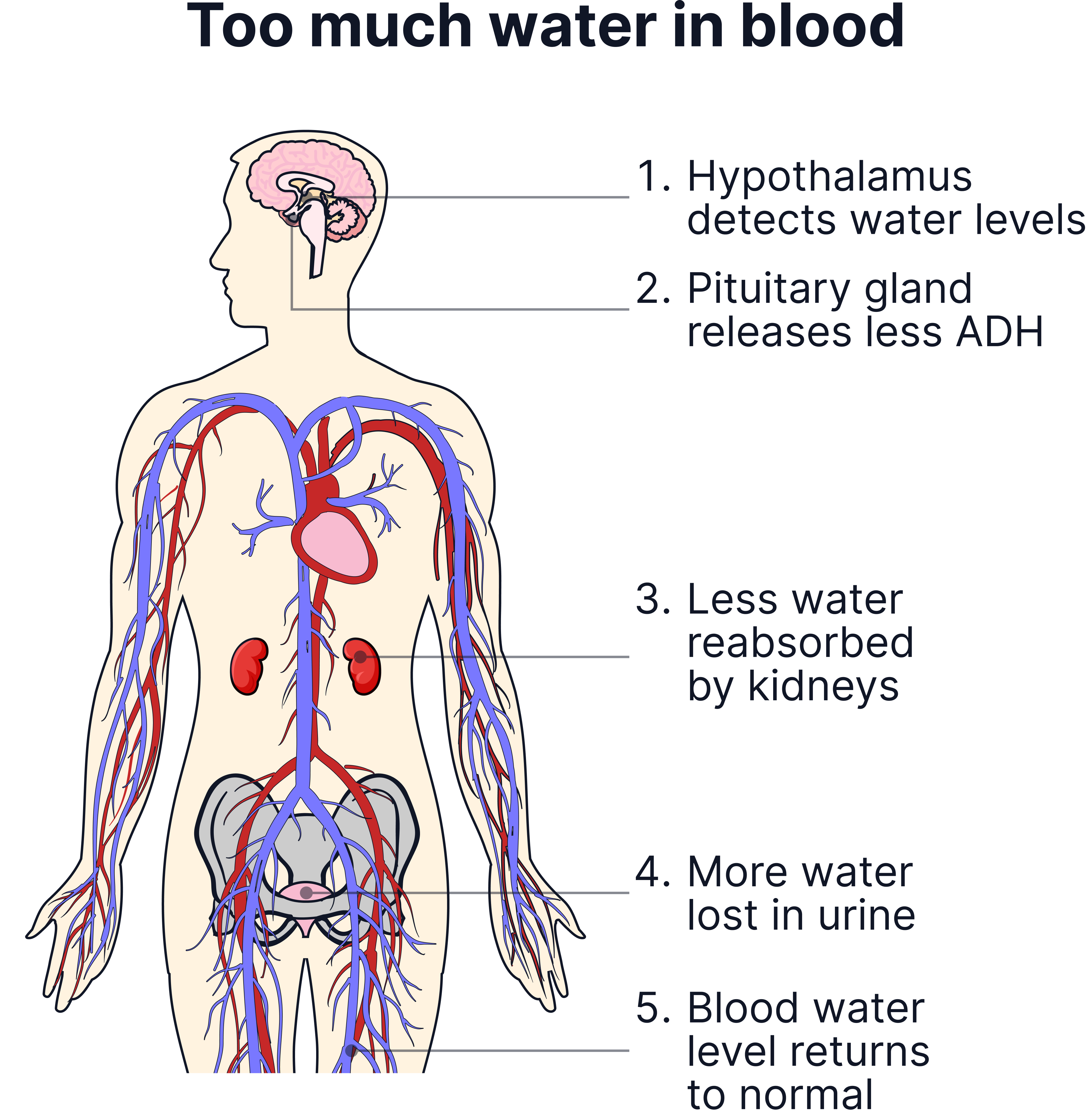If the blood is too dilute (contains too much water), less ADH is released so less water is reabsorbed from the kidney tubules. This means urine produced will be more dilute and there will be greater volumes produced.