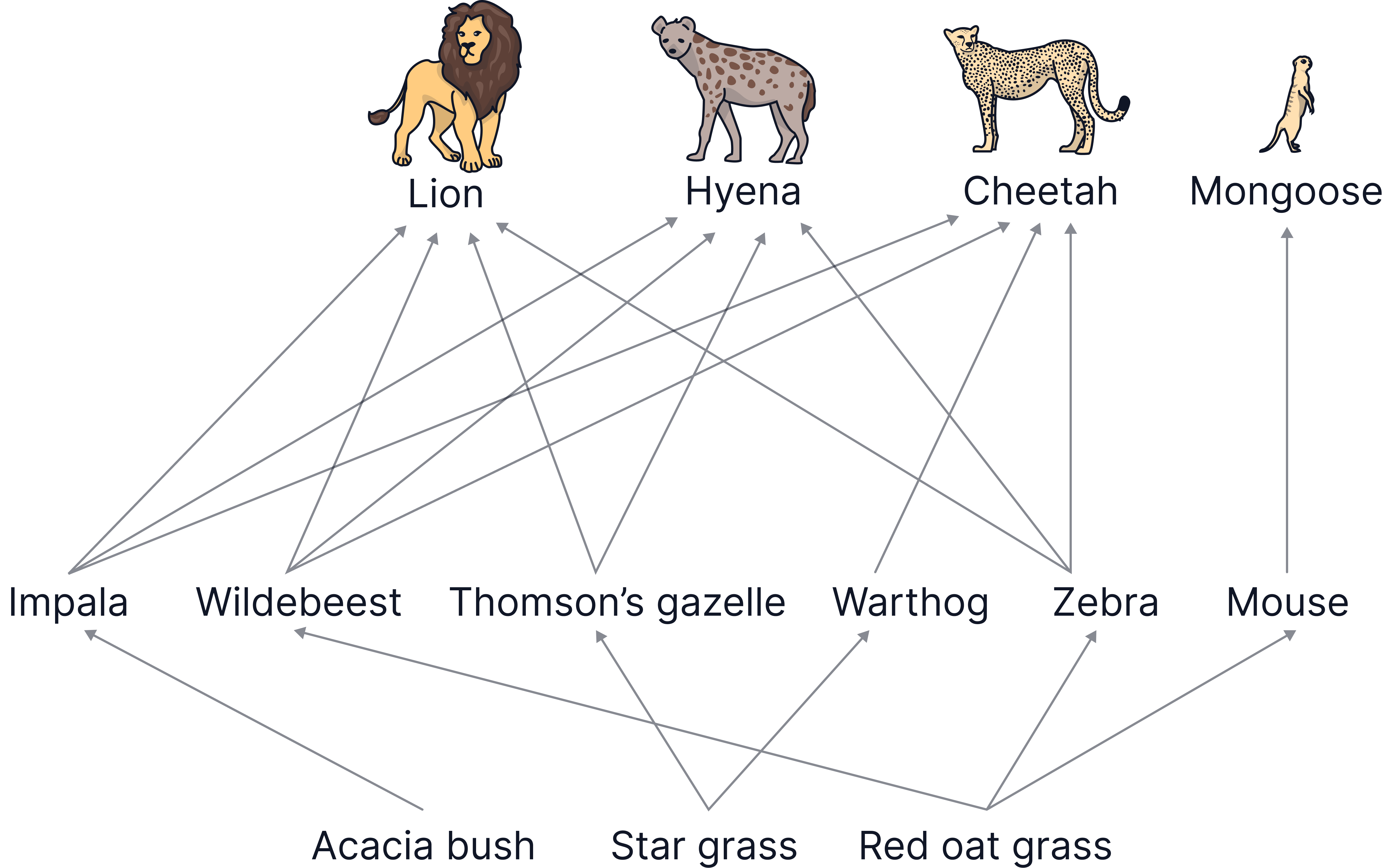 Food web – Lots of connected food chains showing feeding relationships.