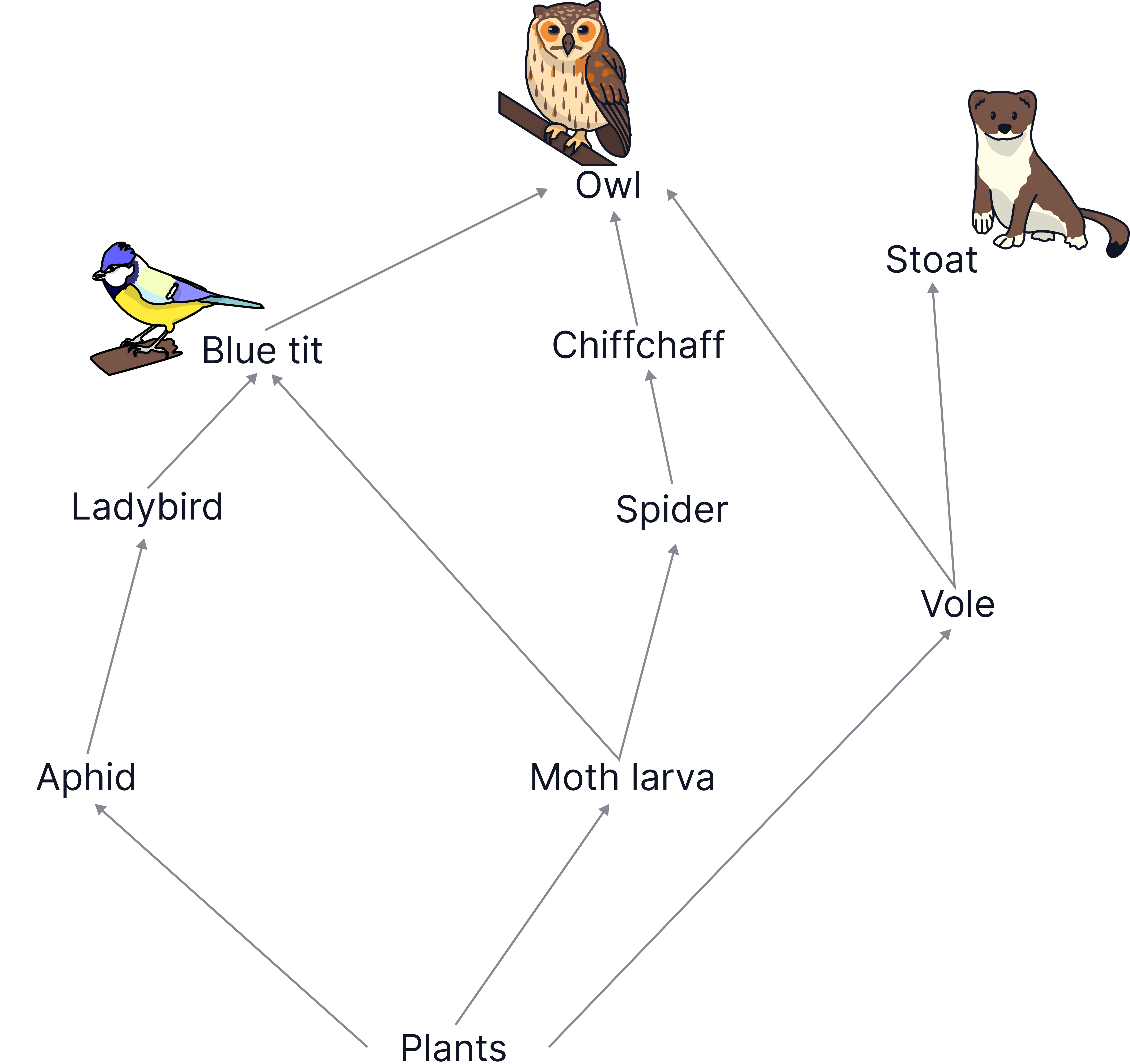 The owl and the stoat could be described as top predators, or apex predators, as they are at the top of the food chain.