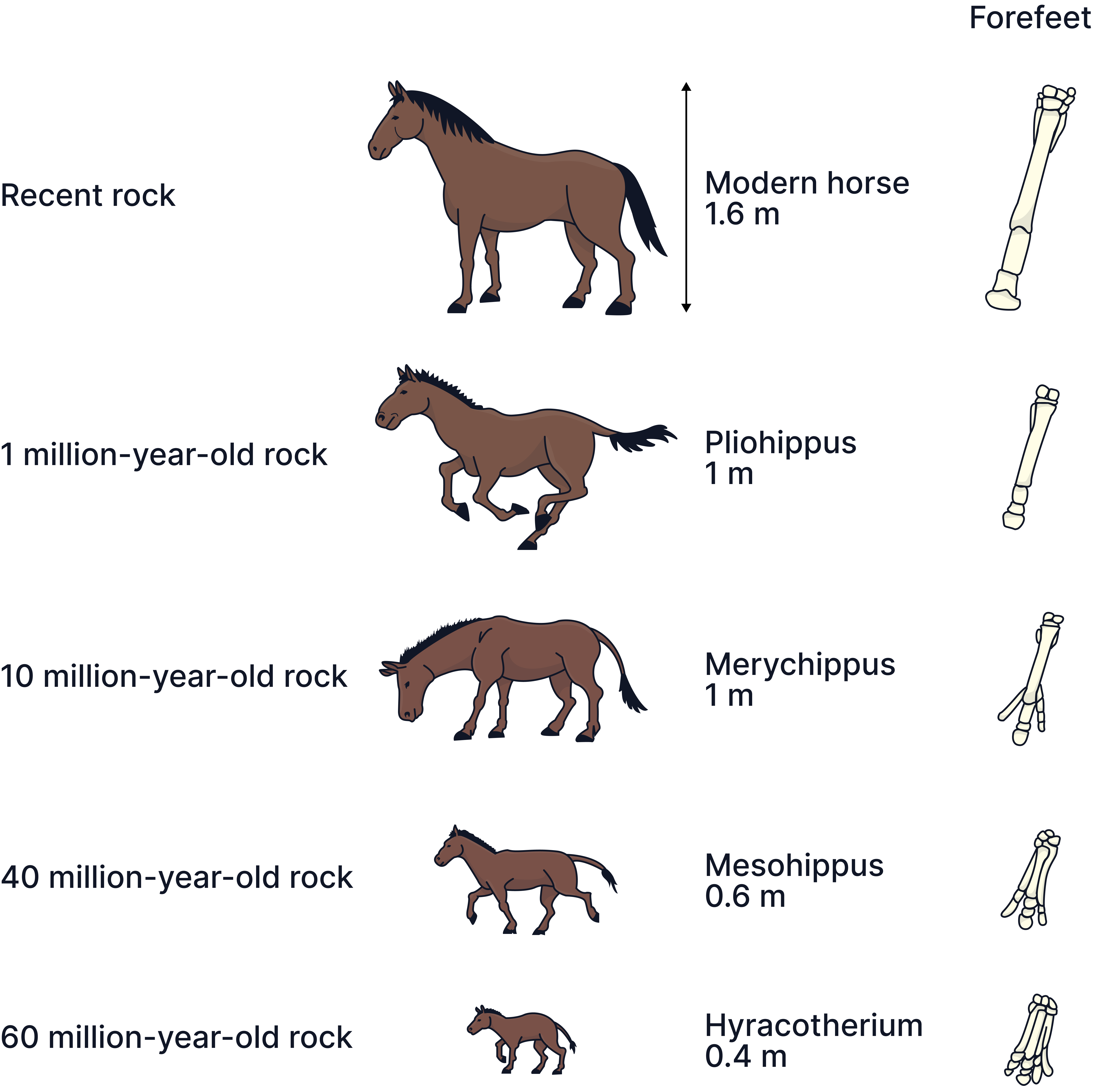 - Example: Fossils of ancient horses show a gradual increase in size and change in hoof structure, adapted to different environments.