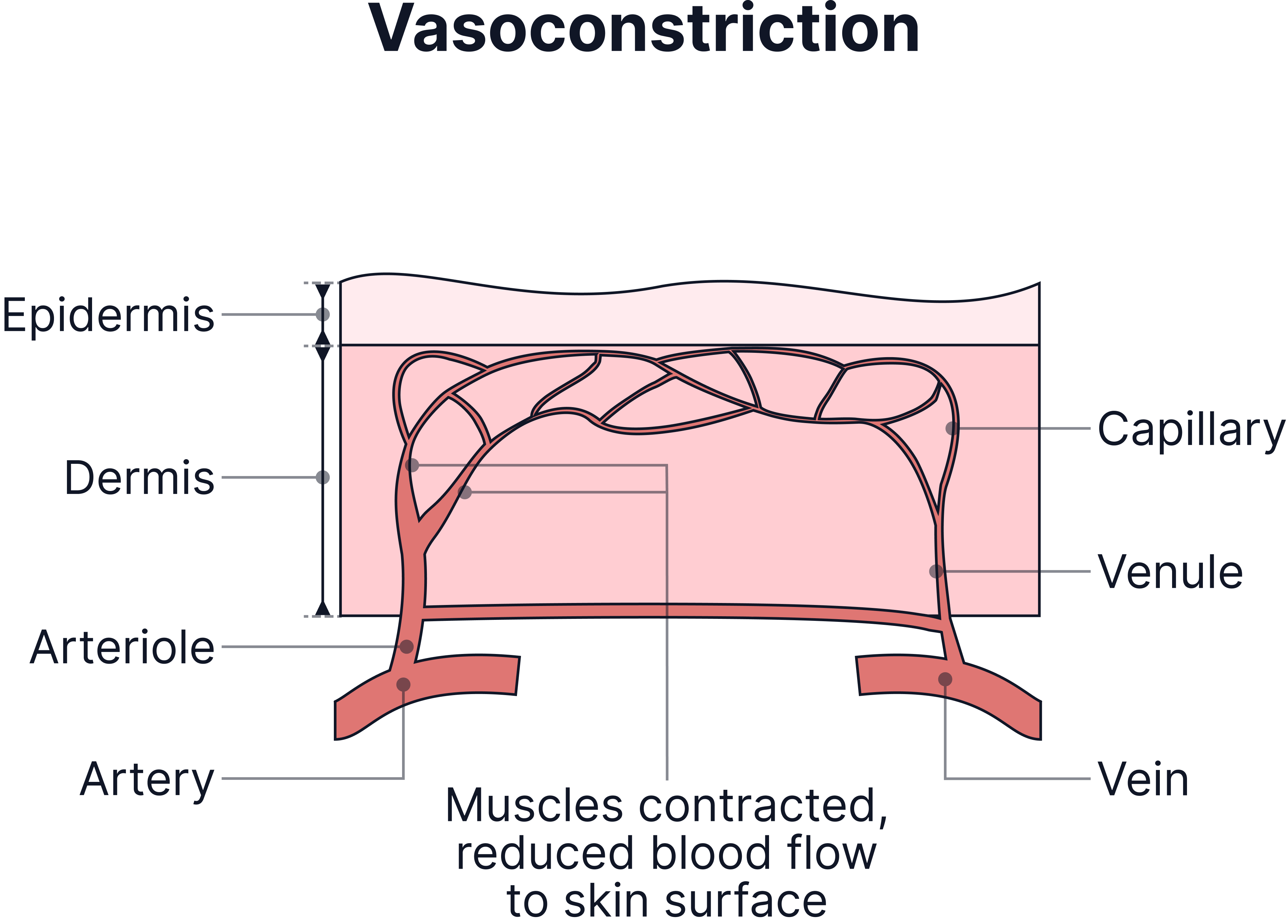 - Vasoconstriction: Blood vessels near the skin surface constrict (narrow), reducing blood flow to the surface and reducing heat loss through the skin.
