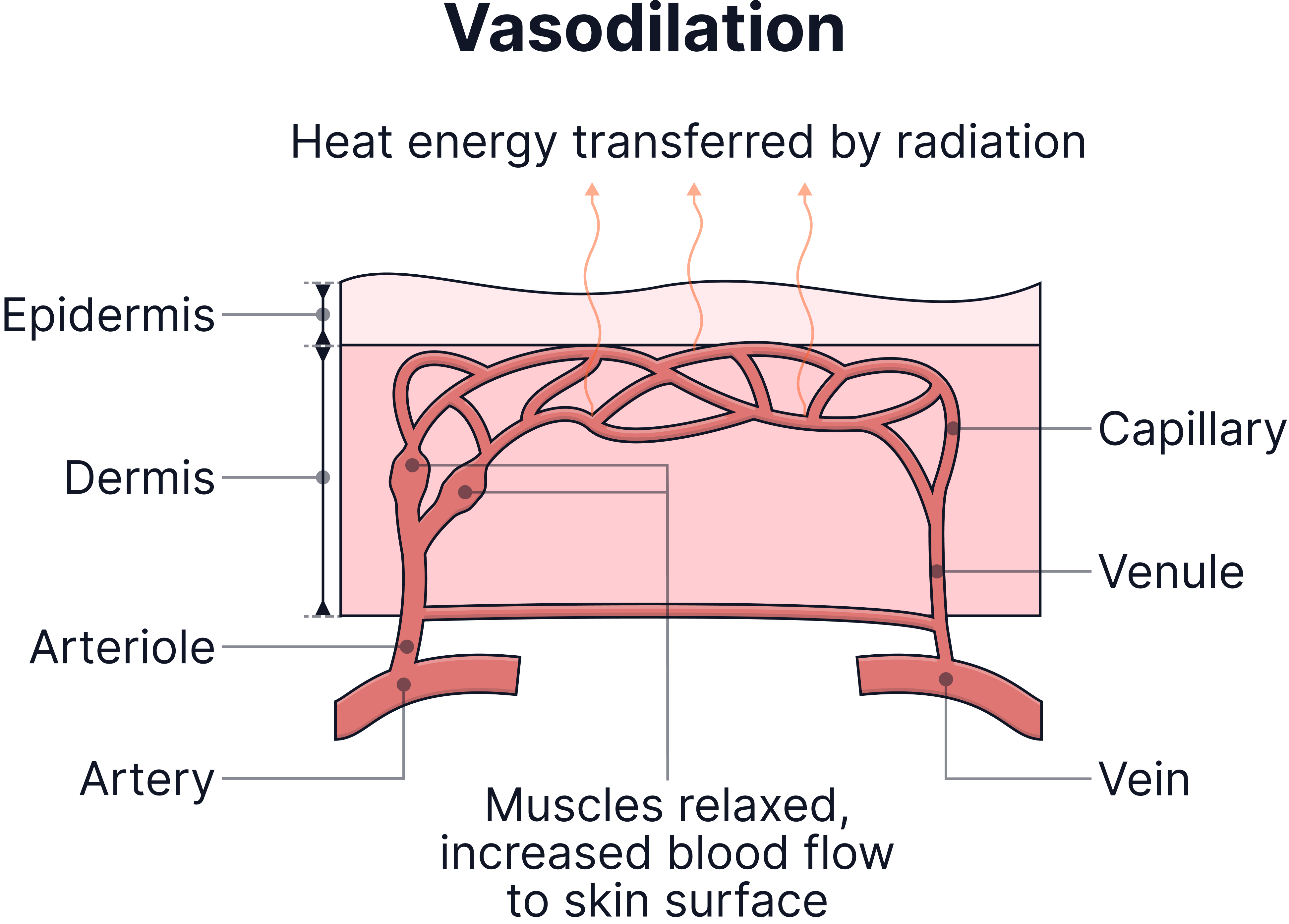 Vasodilation: Blood vessels near the skin surface dilate (widen), increasing blood flow to the skin surface so more heat energy is lost through the skin.