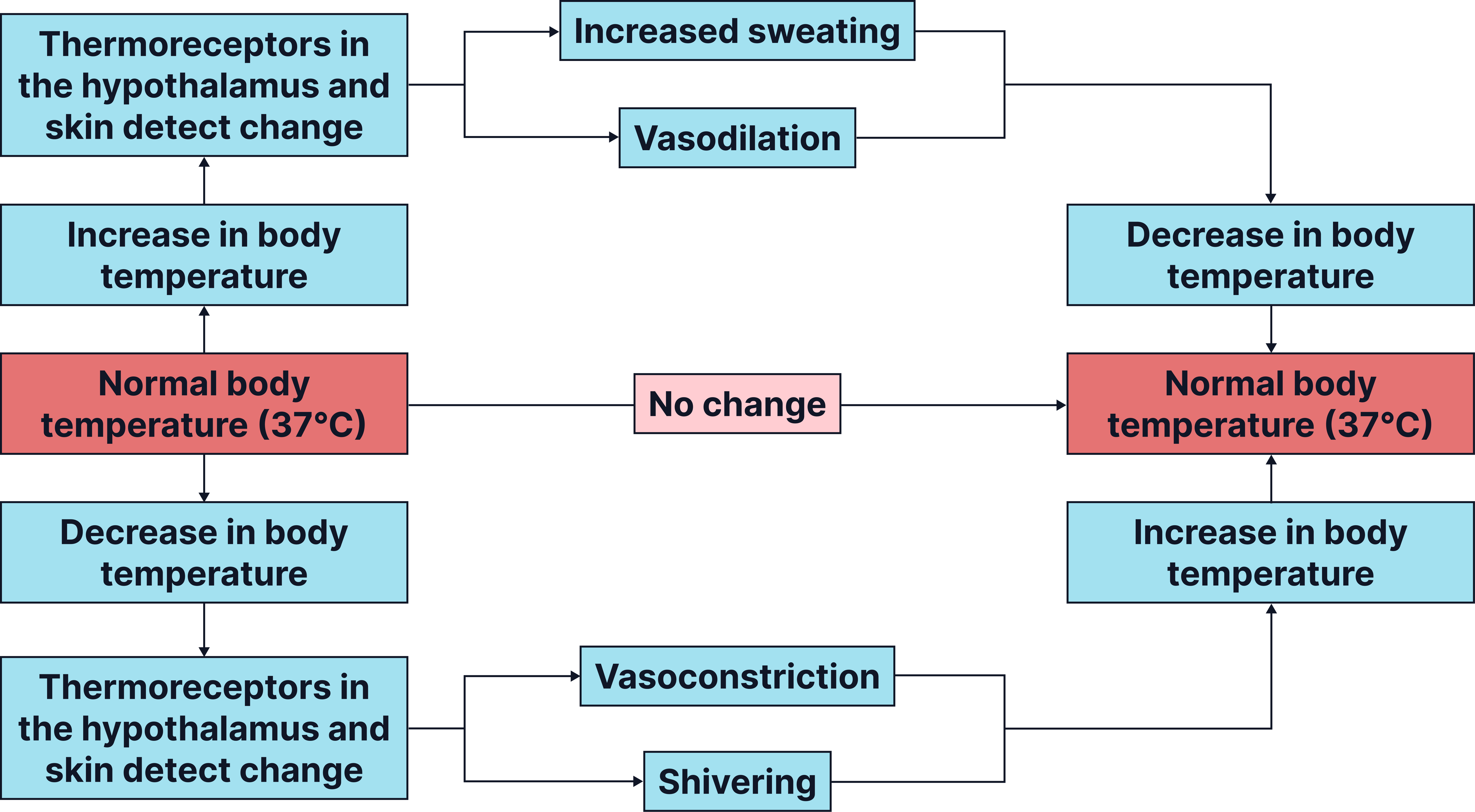 The thermoregulatory centre uses negative feedback to keep body temperature within a narrow range:
