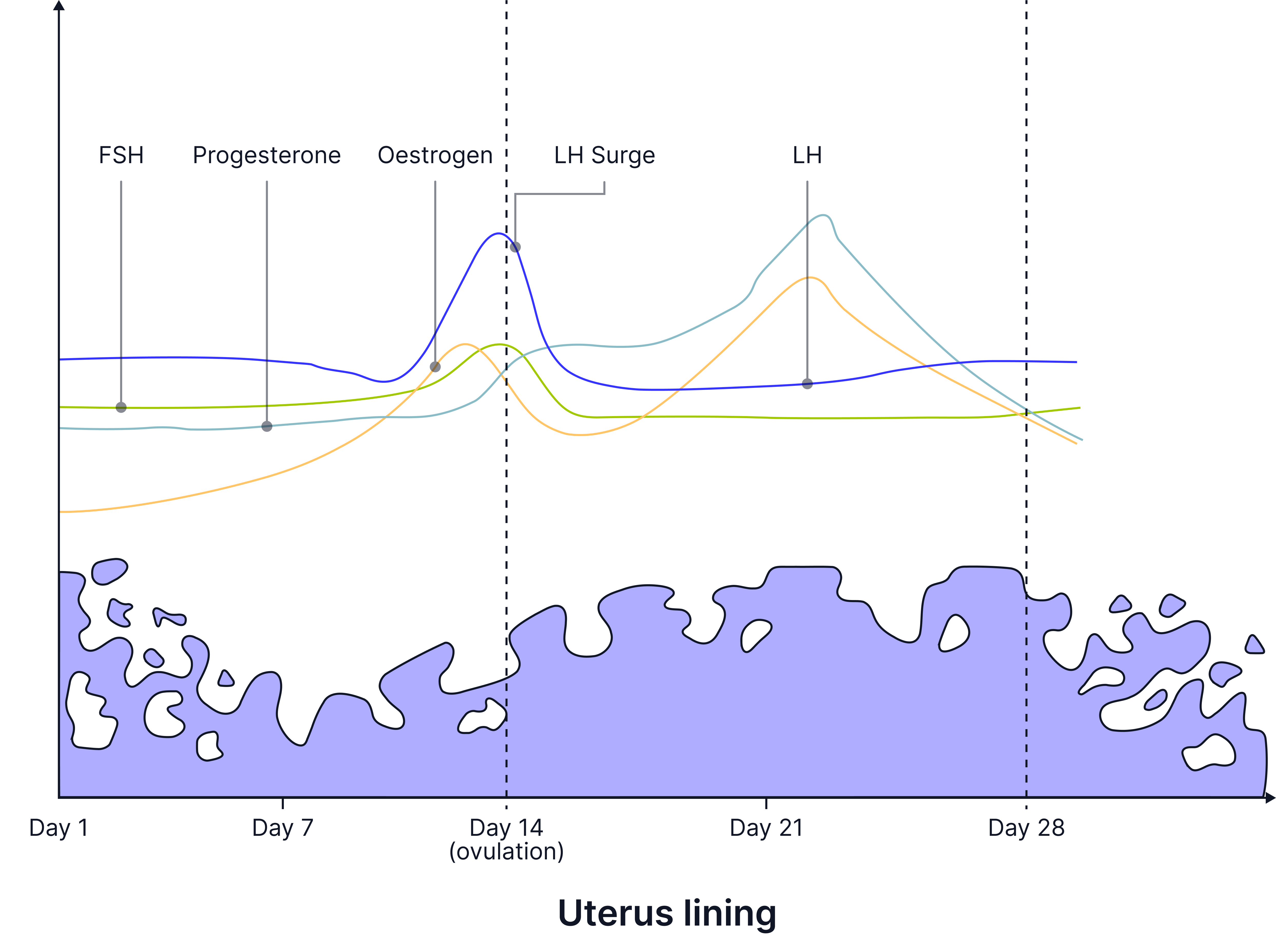 - Day 1–14: FSH increases, egg matures, oestrogen thickens the uterus lining.