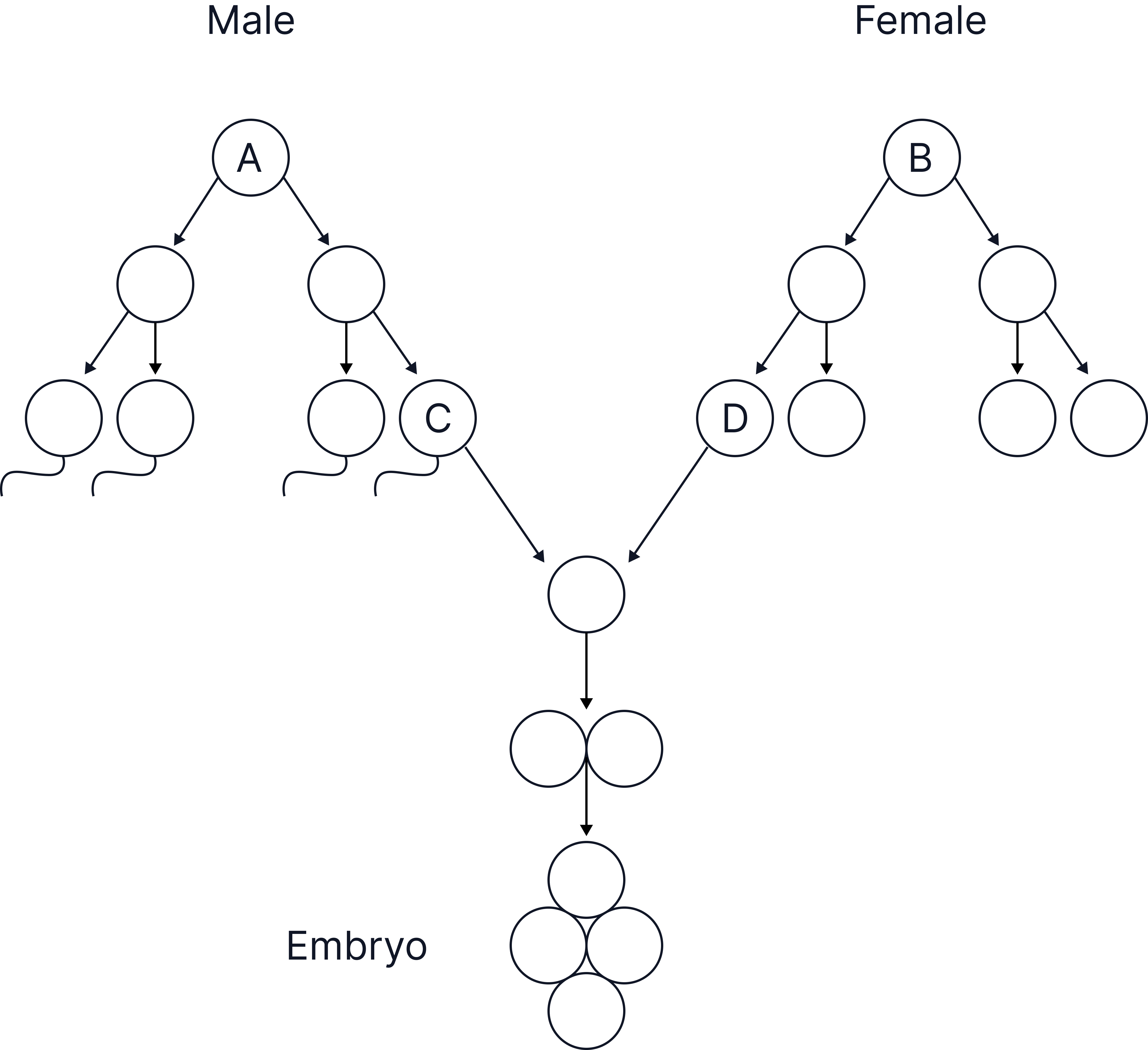 - Two haploid gametes fuse at fertilisation to form a diploid zygote.