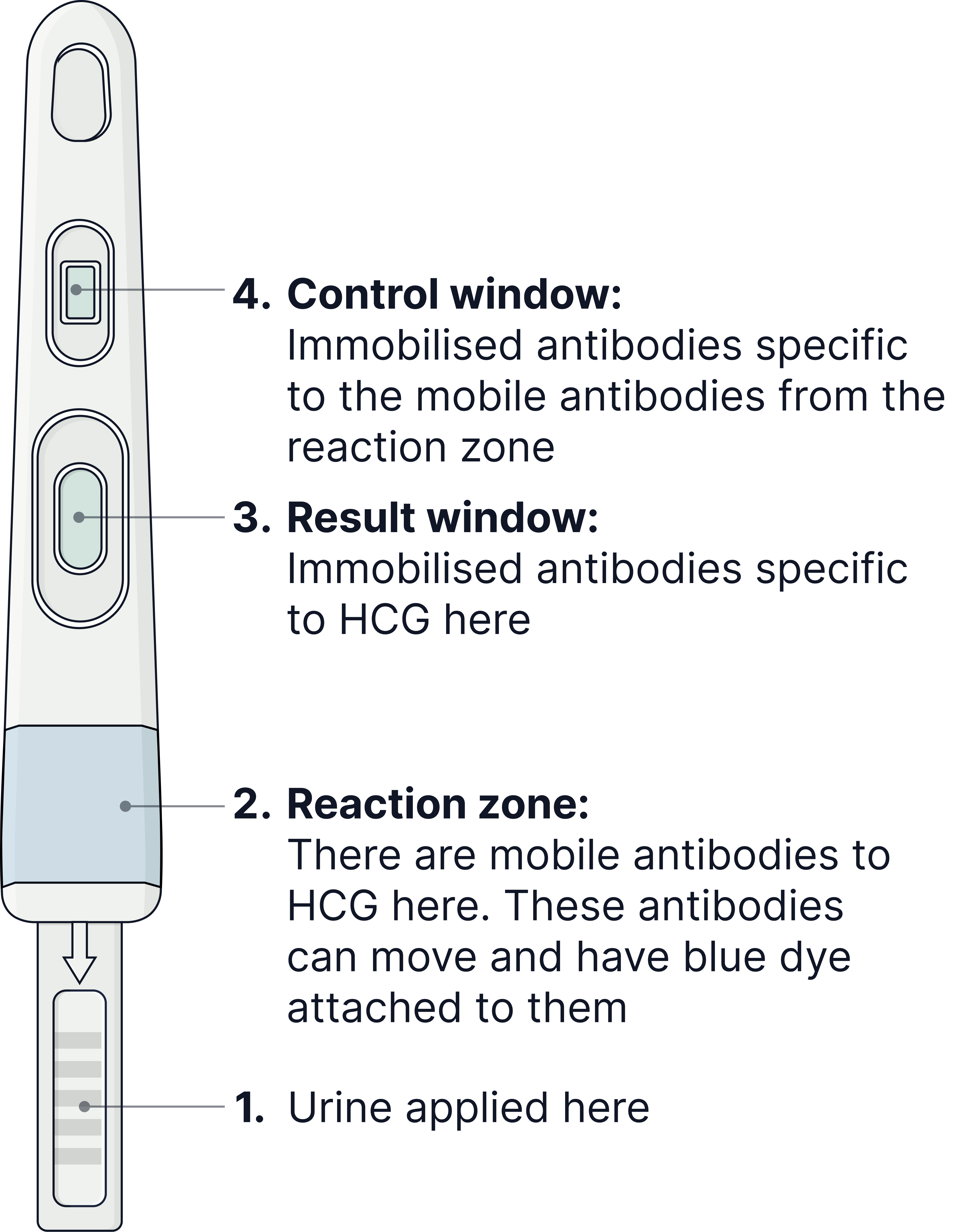 In the results zone the HCG hormone binds to the immobilised HCG antibodies. - Other mobile antibodies that did not have HCG attached will bind to immobilised antibodies in the control zone.