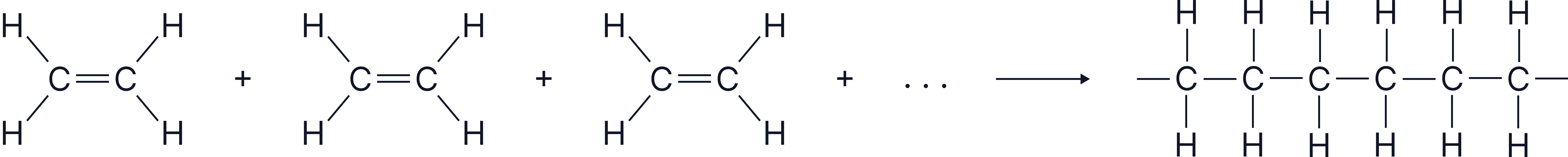 A simplified representation of ethene monomers connecting to form a long-chain addition polymer.