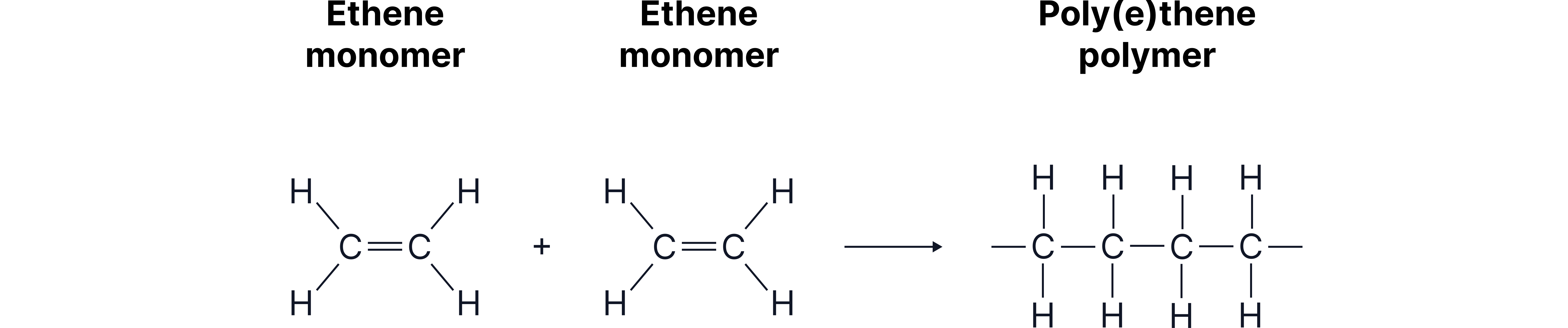 Ethene molecules link through their opened double bonds to produce the polymer poly(ethene).