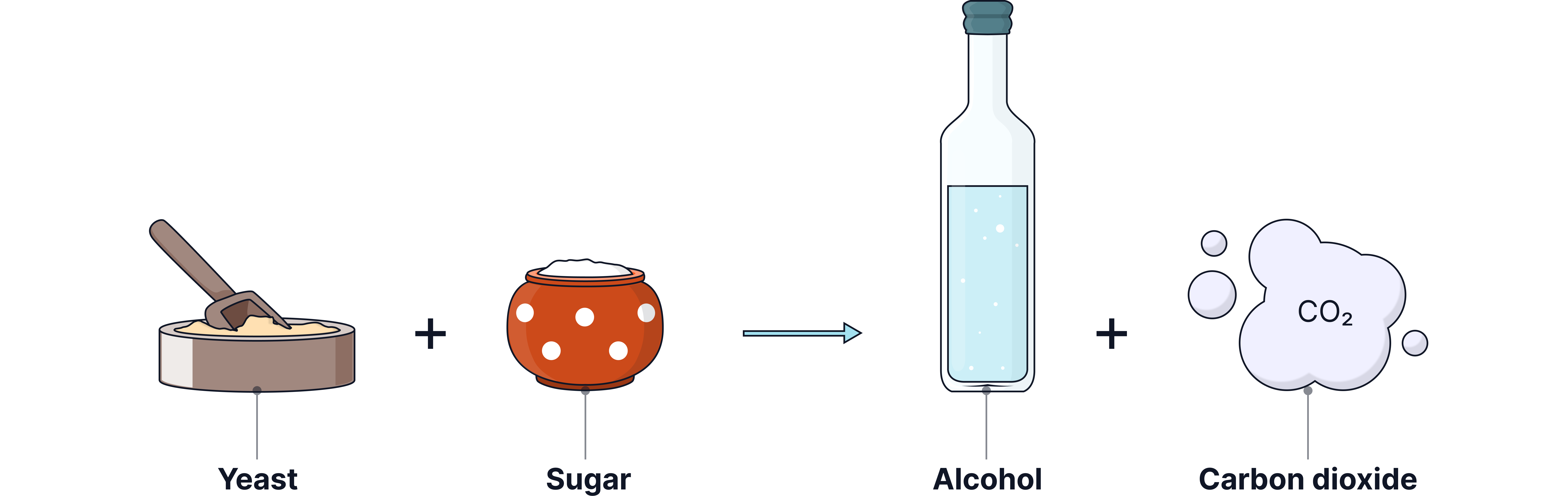 Yeast enzymes convert sugar into ethanol and carbon dioxide:
