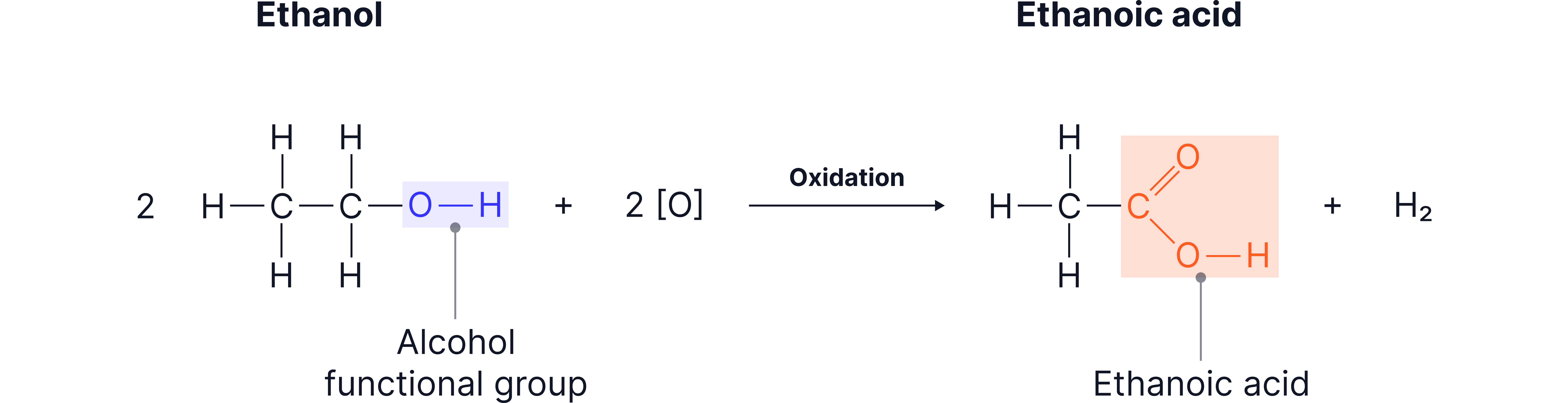 Caption: “Ethanol converting into a ethanoic acid when exposed to oxygen, illustrating loss of hydrogen and gain of oxygen.”