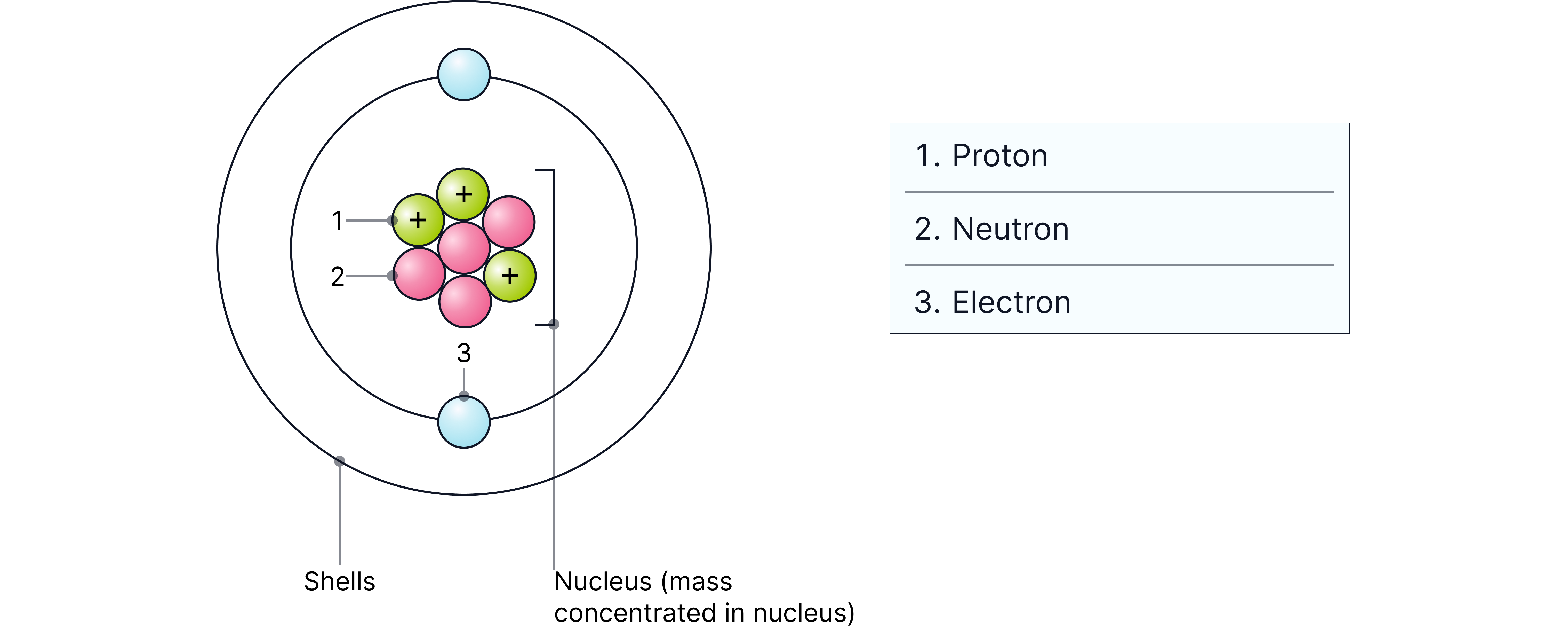 Proton | +1 | 1 | Nucleus |