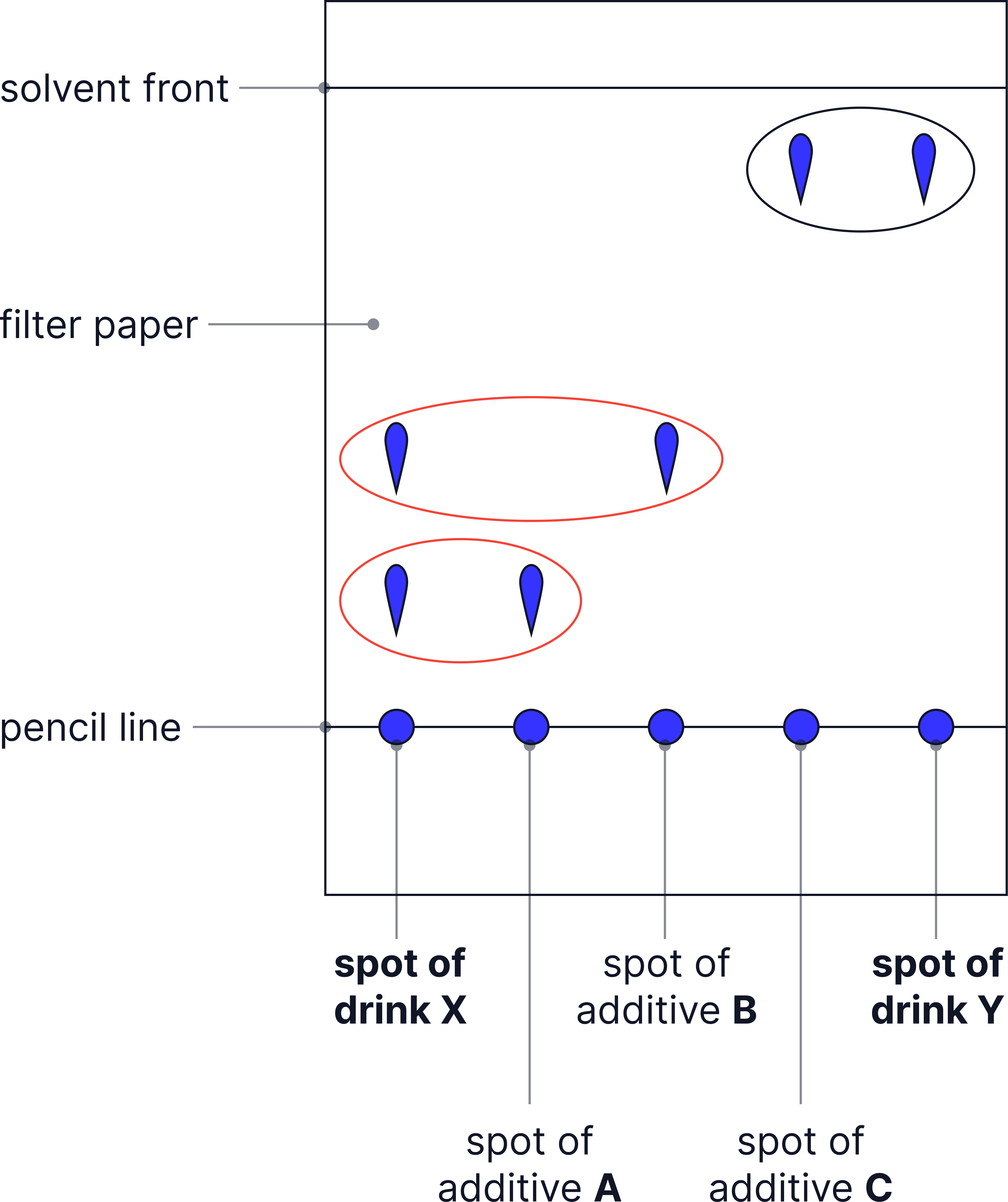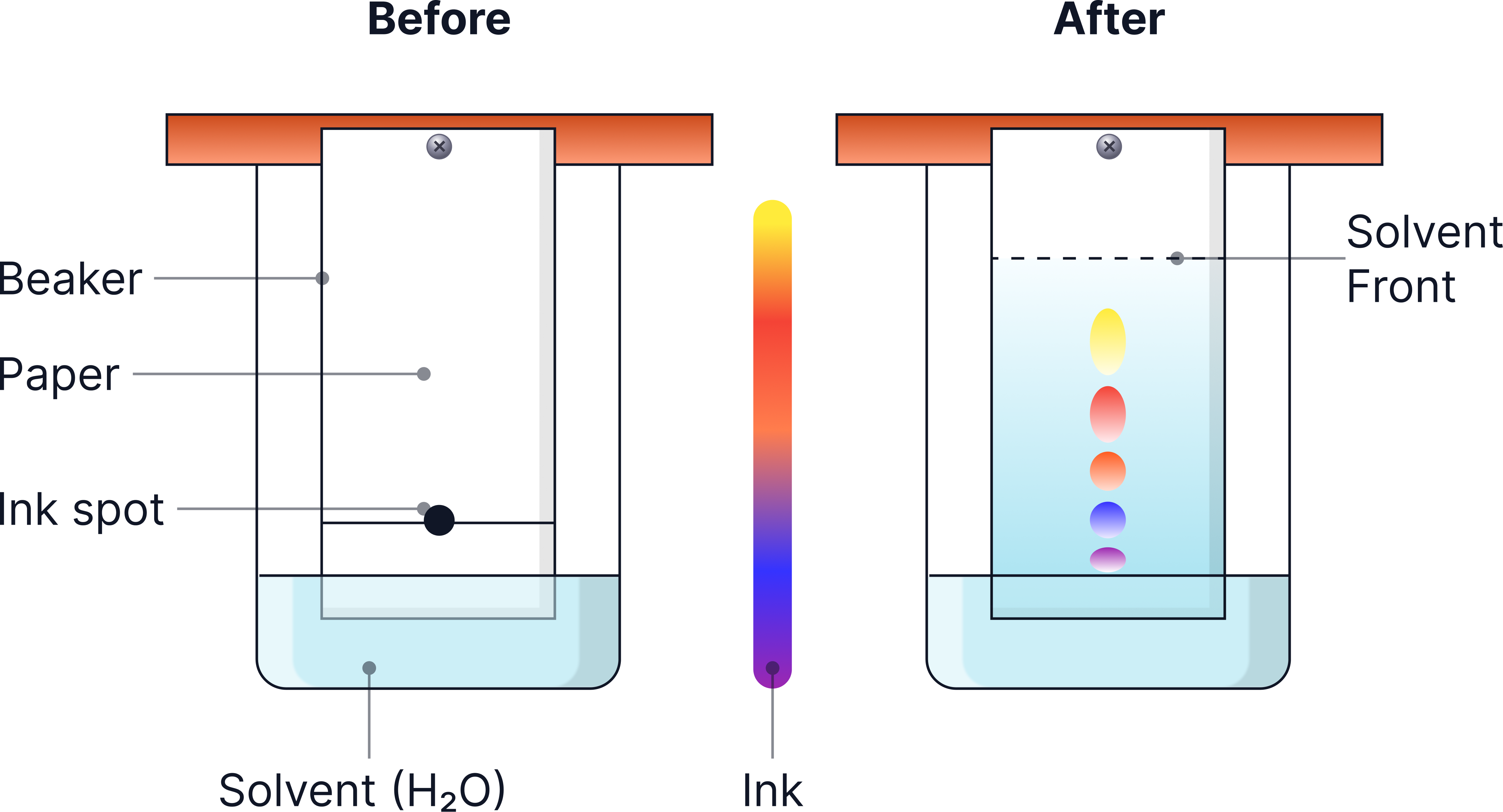 - The paper is placed in a solvent, with the spot above the solvent level.