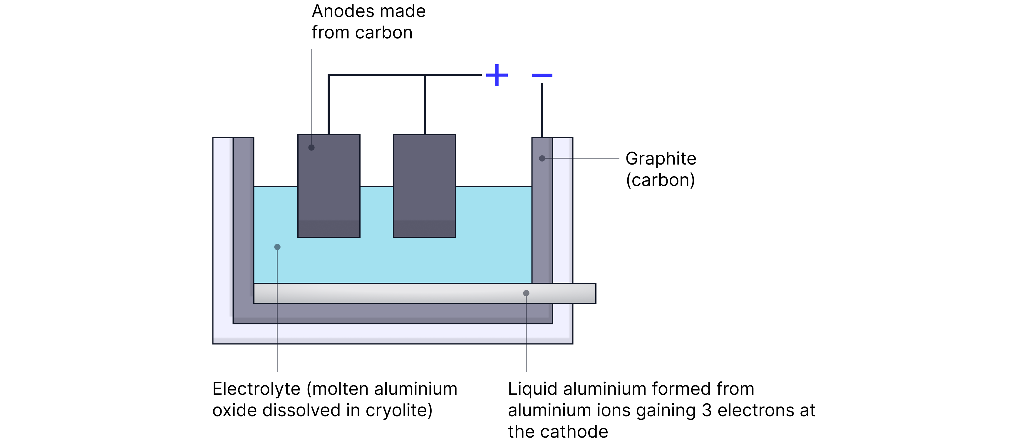 Conductor used | Graphite (inert carbon) – needs replacing due to oxygen reacting with anode in the electrolysis of |