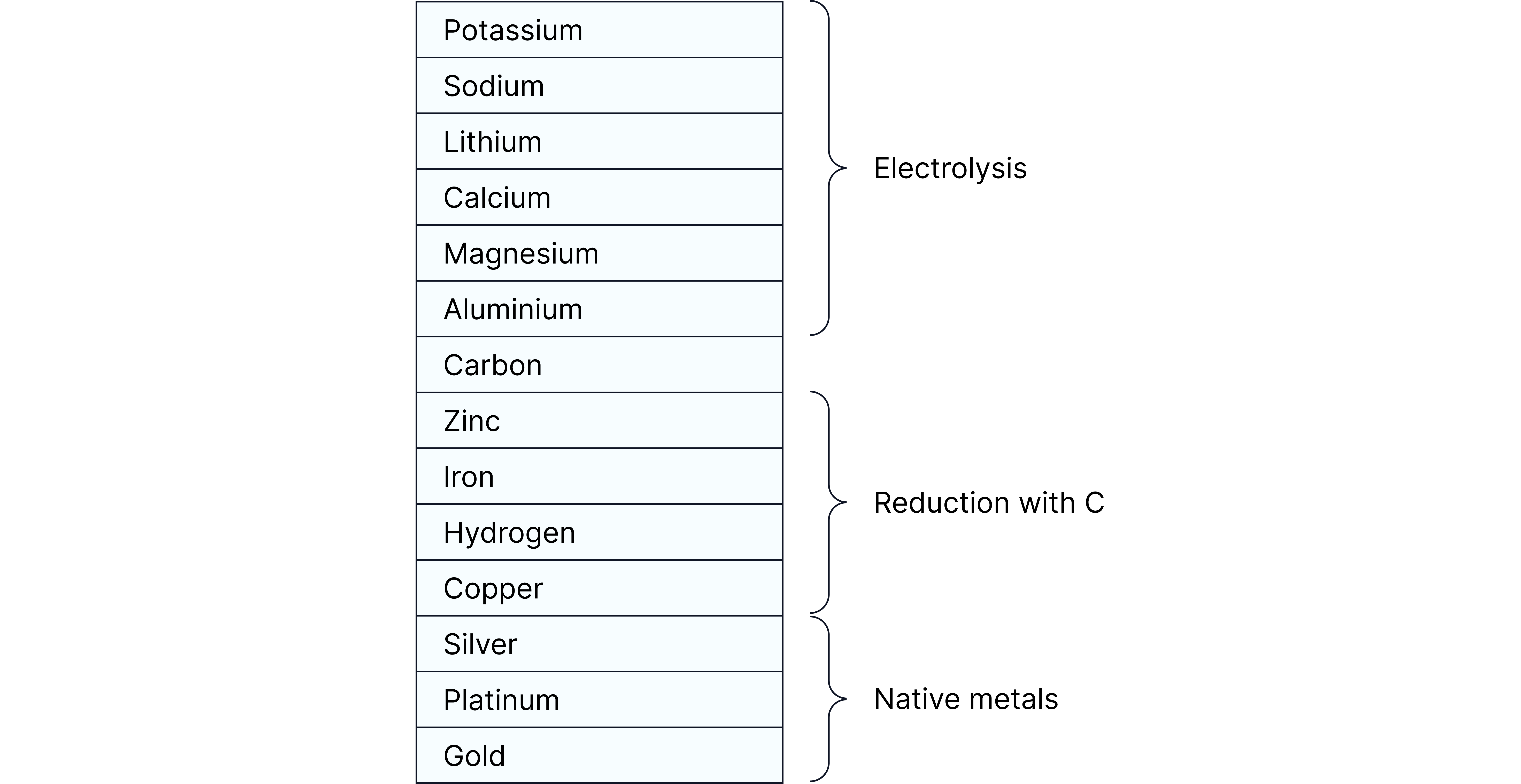 Potassium, Sodium, Calcium, Magnesium, Aluminium | Above Carbon | Electrolysis | Too reactive to reduce with carbon |