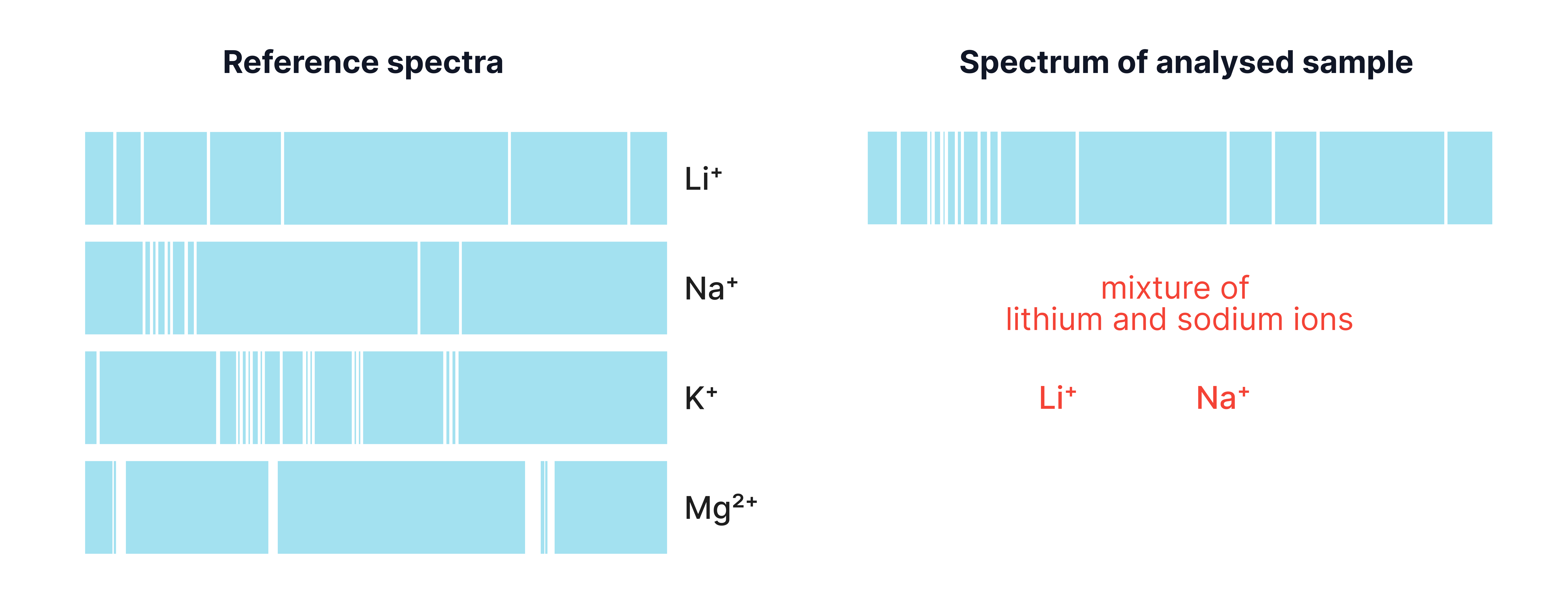 Each metal ion produces a unique set of lines, so lines from different ions can be observed and identified even when mixed