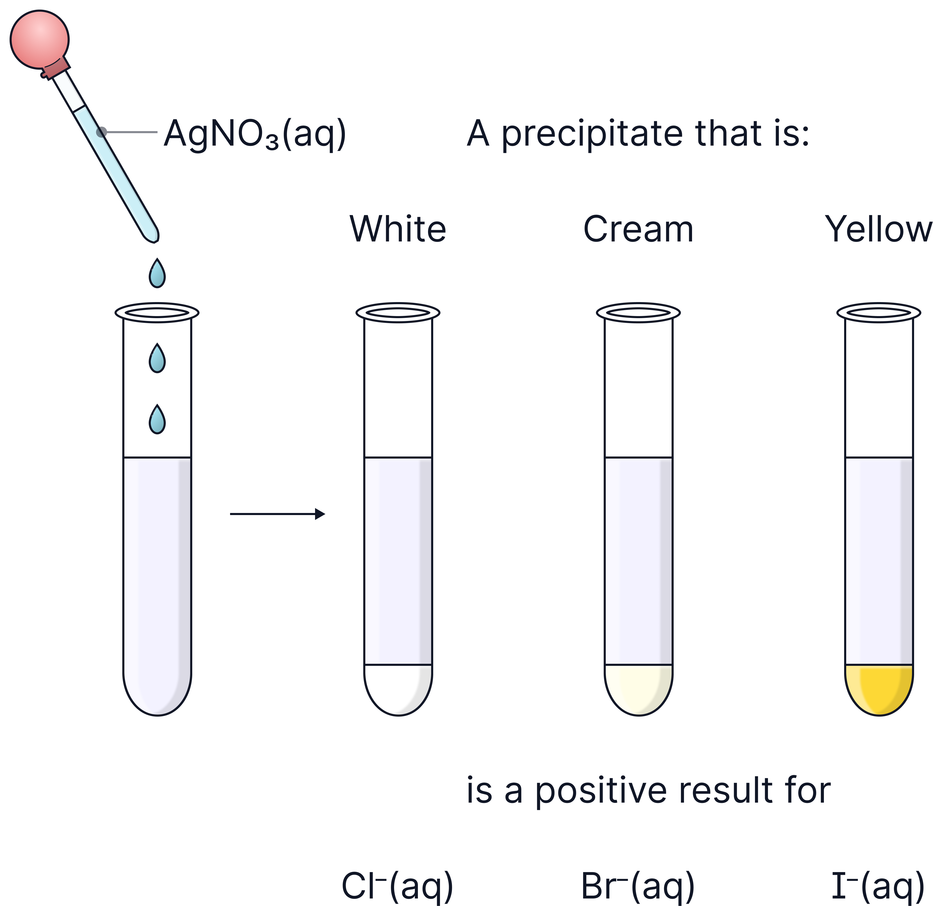 The halide ions in the solution react with silver ions from silver nitrate solution to form insoluble silver halides (AgCl, AgBr or AgI). Each silver halide forms a distinctive precipitate colour, which identifies the halide present (as seen in the table above)
