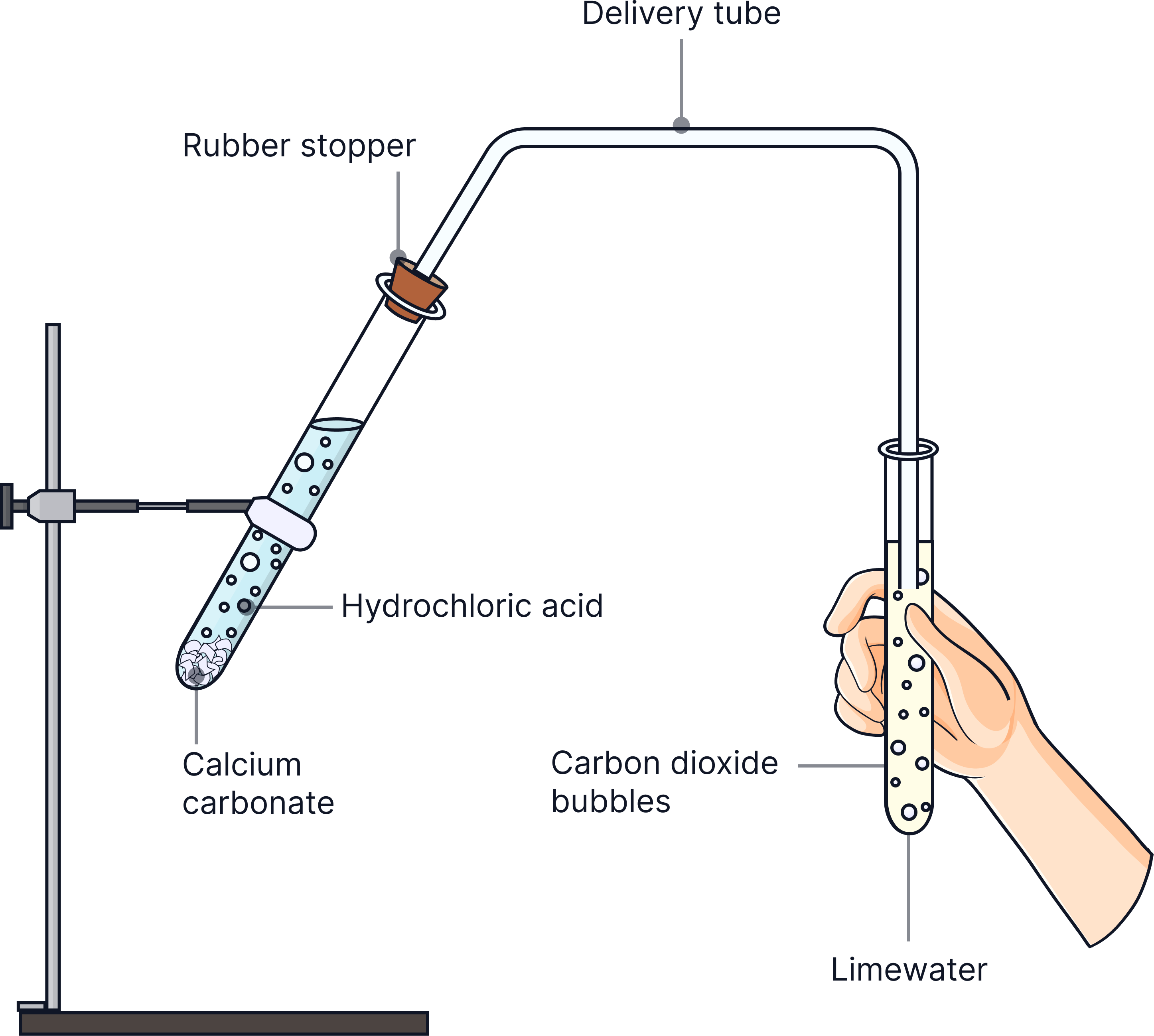 2) Look for bubbles of gas and bubble gas through limewater by connecting a bung attached to a delivery tube