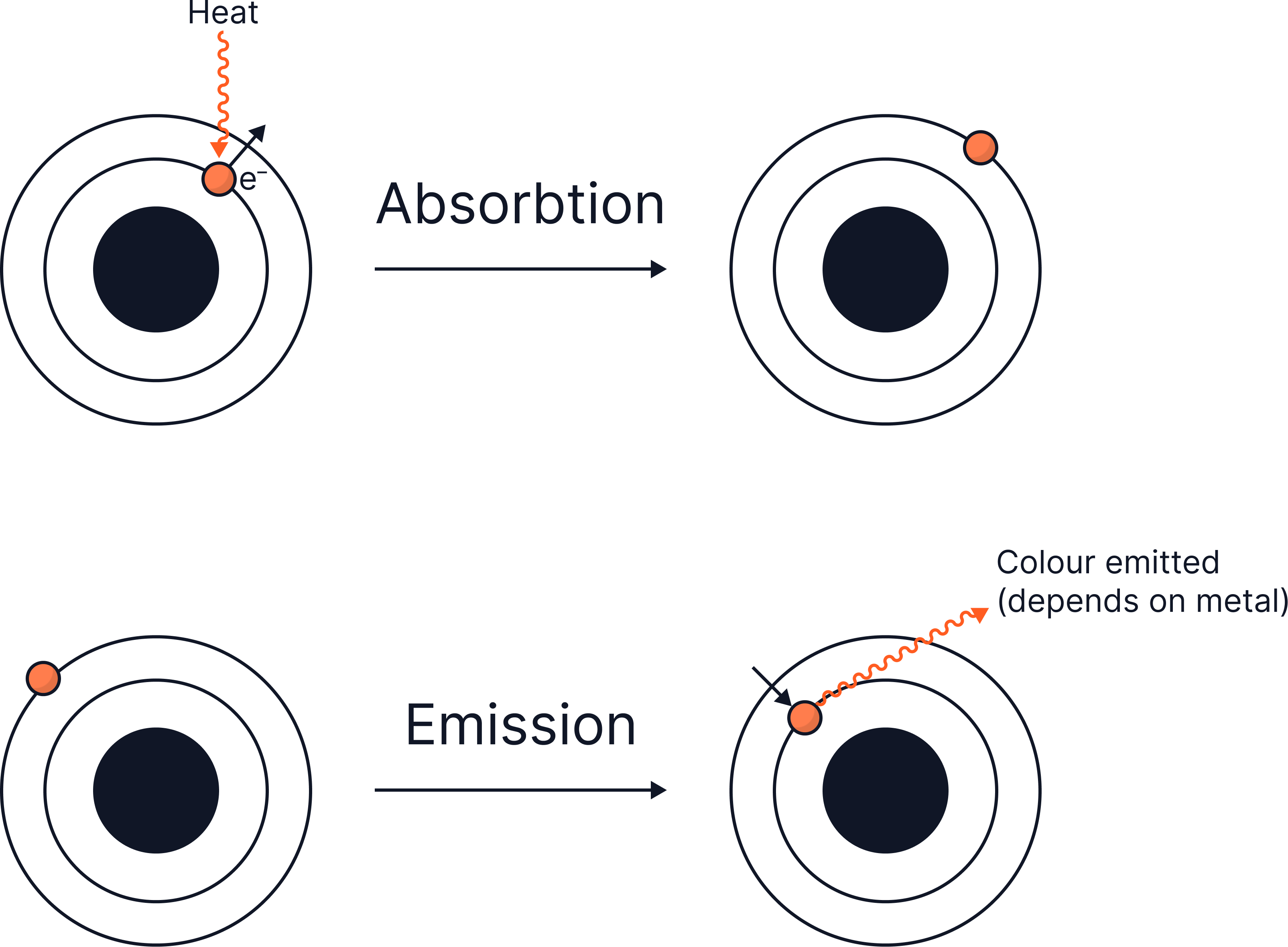 Heating ions excites electrons and they absorb energy (absorption). When electrons fall back to their ground state – lowest energy level, they emit light of a characteristic wavelength, producing a specific, unique flame colour (emission).
