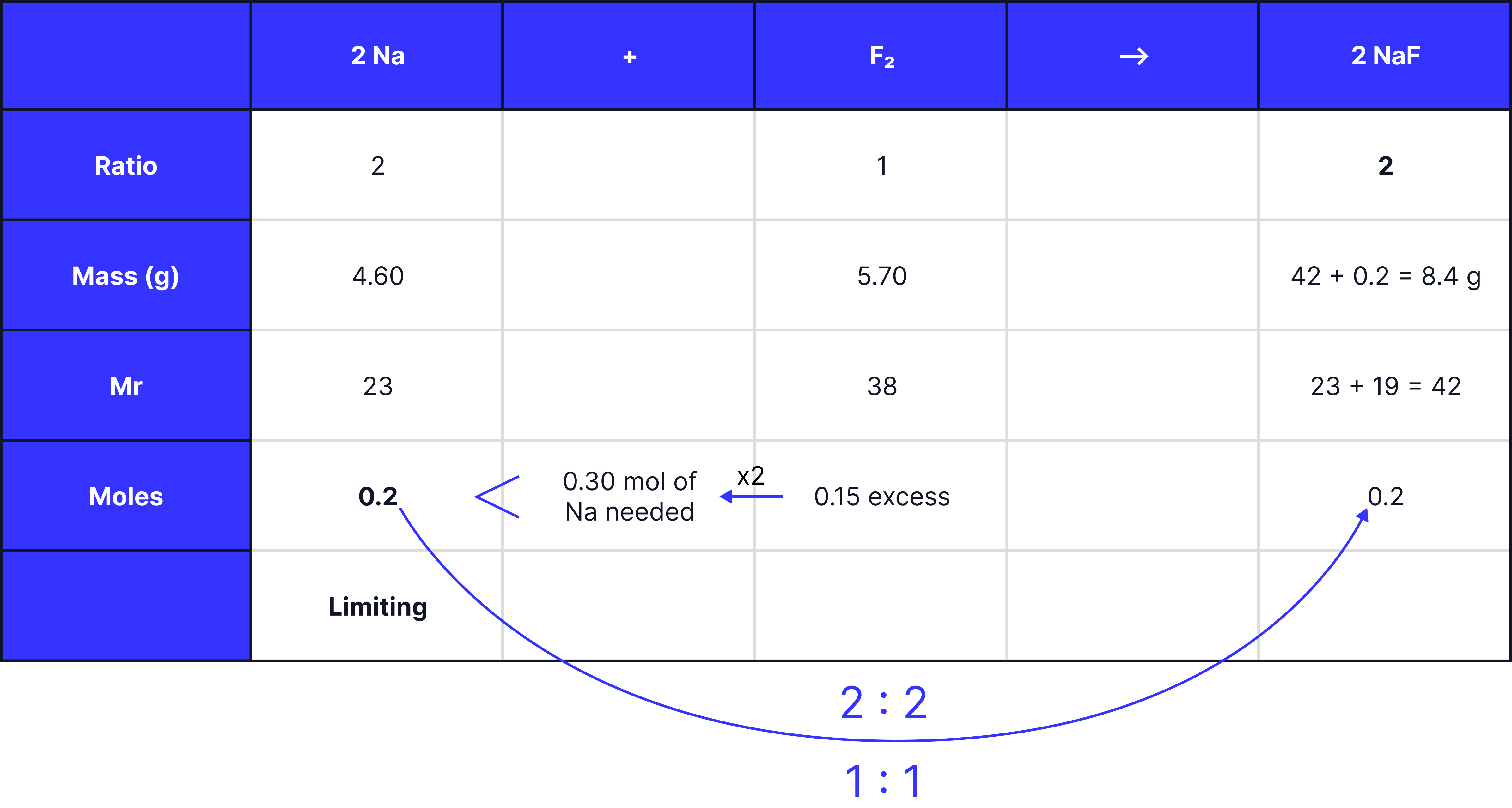 When the reactants don’t react in a 1:1 ratio, the number of moles can not be directly compared. Instead, the molar ratios from the balanced symbol equation are used to determine how much of each reactant is needed.