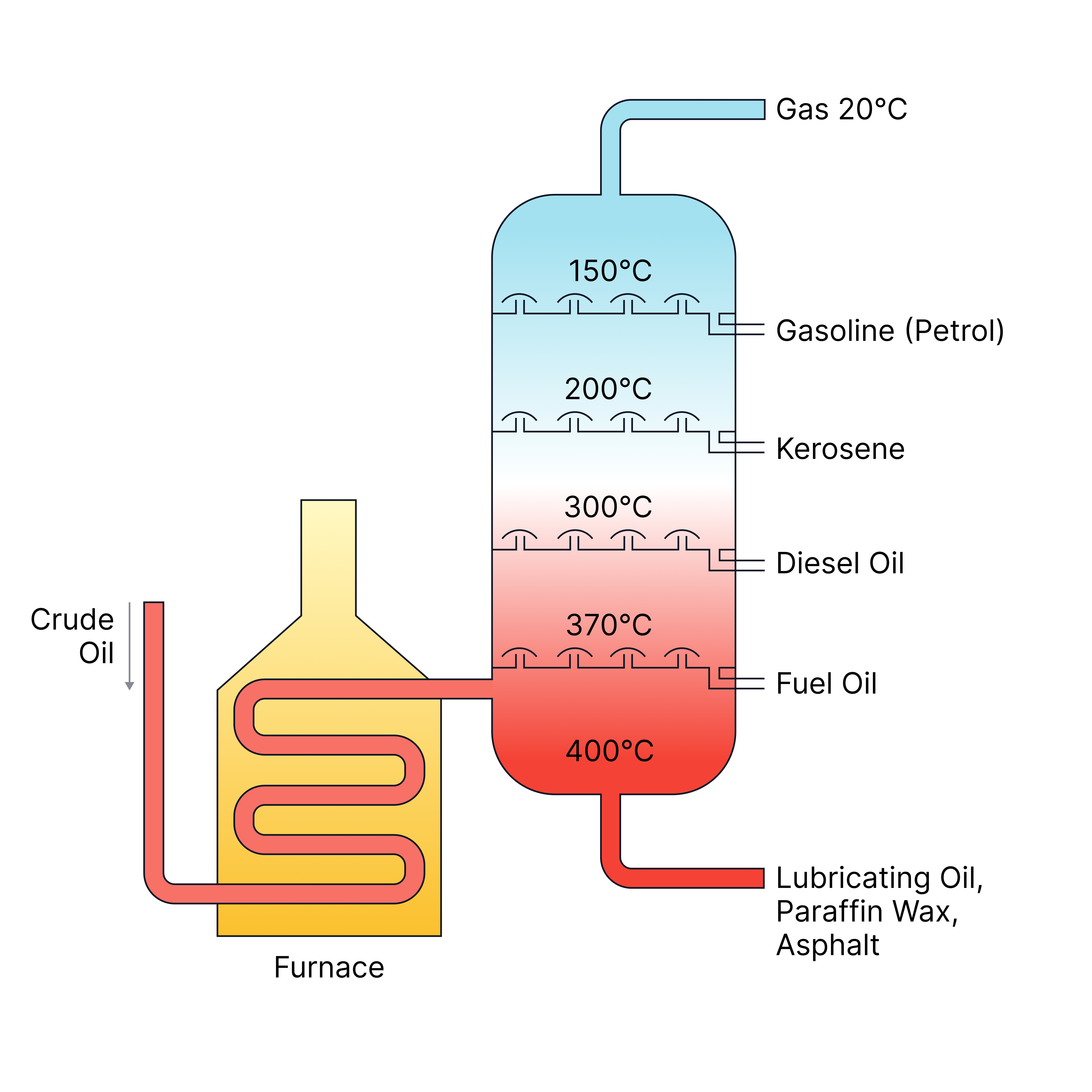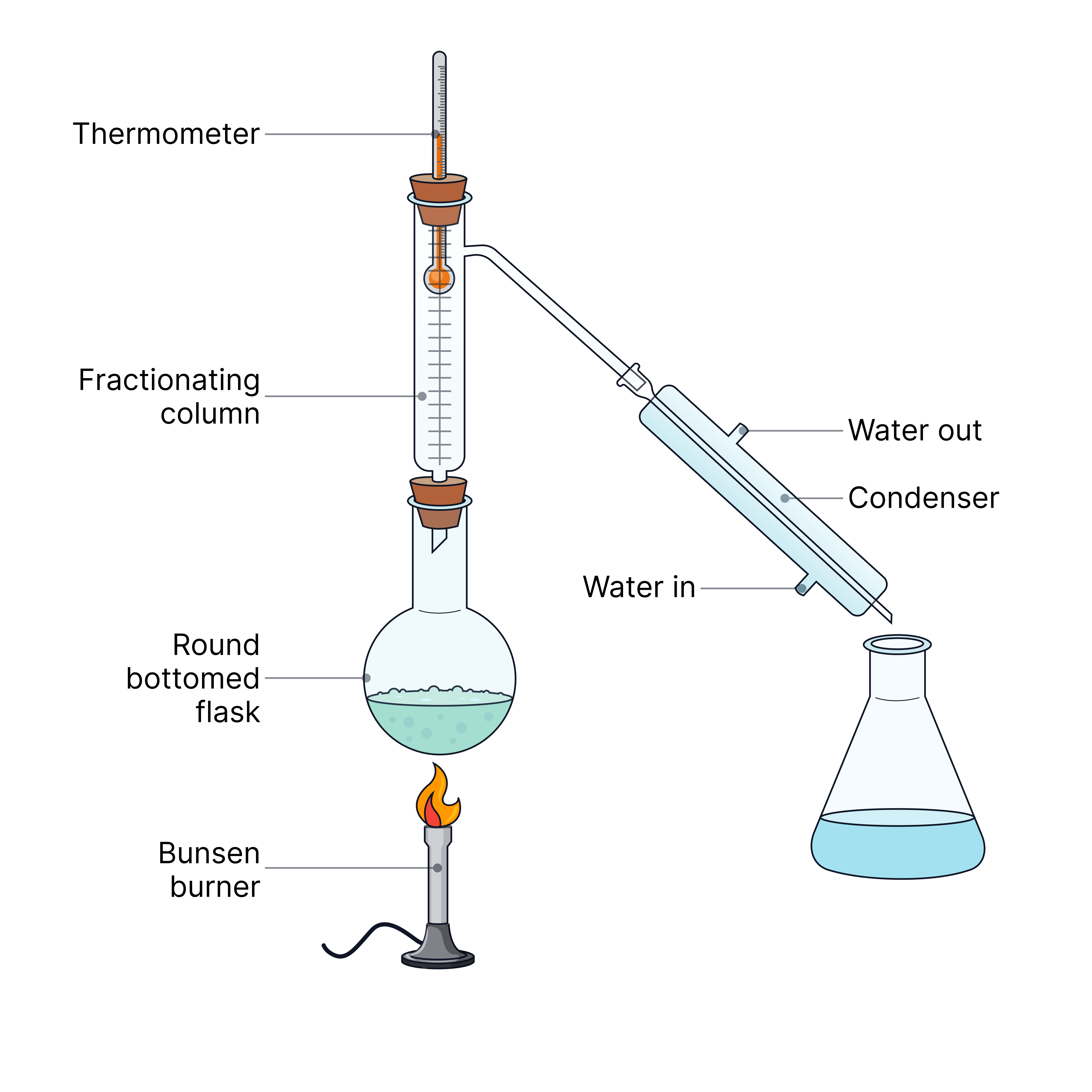 Fractional distillation | Two or more liquids with different boiling points | The mixture is heated; liquids boil and condense at different temperatures