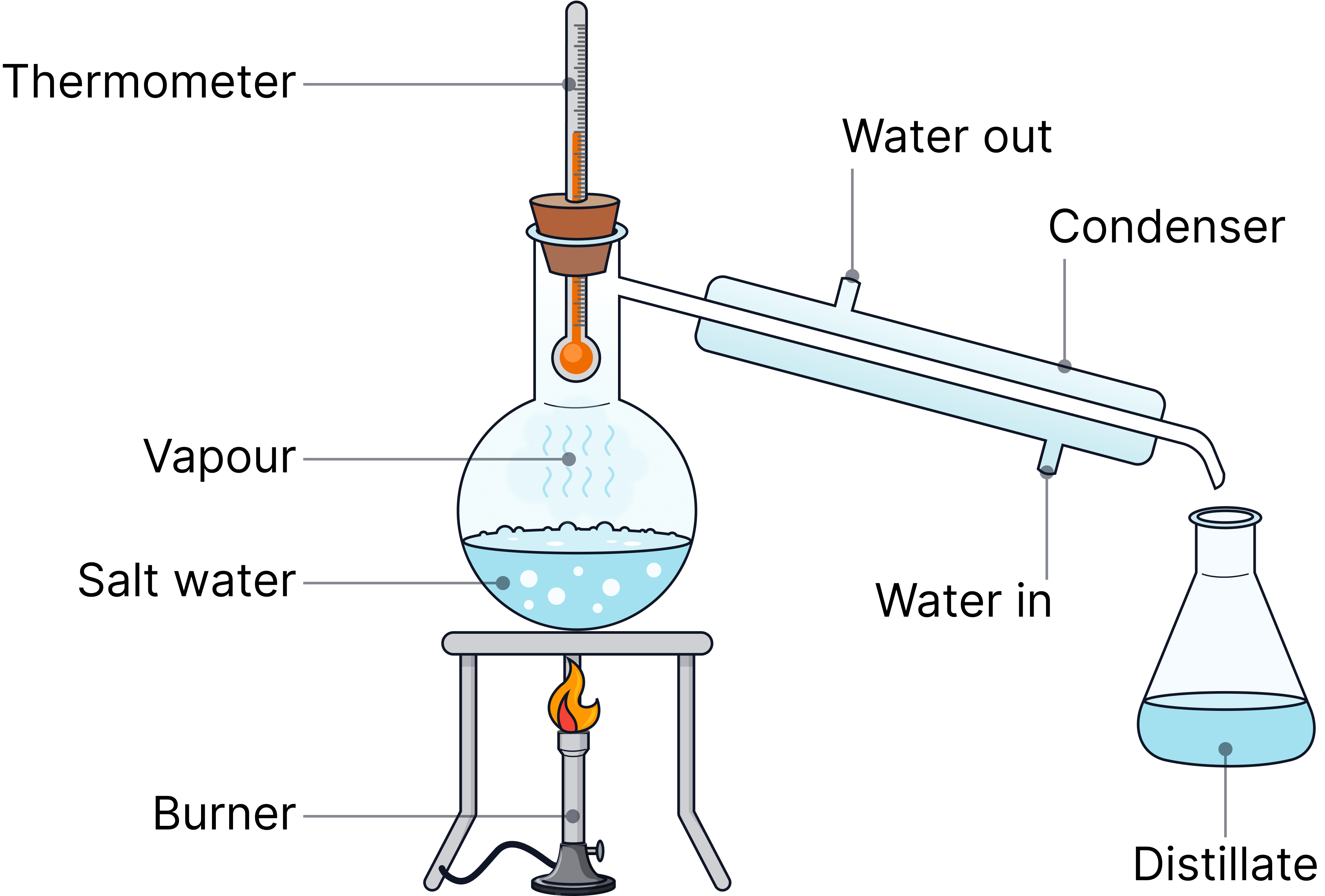 Simple distillation | Solvent from a solution | The solvent boils, evaporates, then condenses into a separate container.