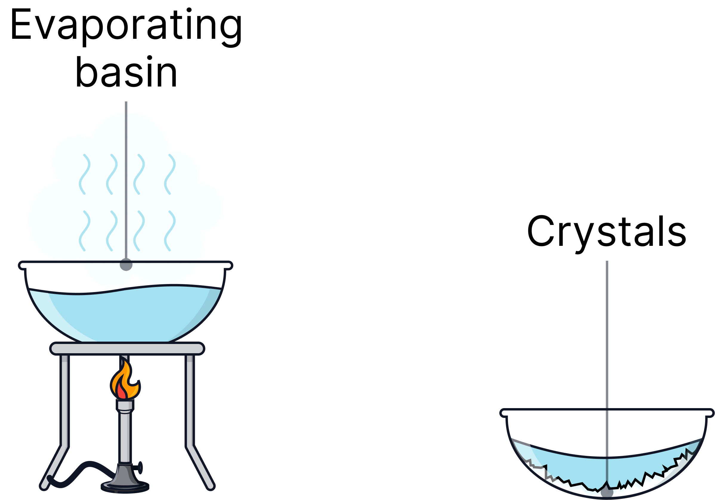 Crystallisation | Soluble solid from a solution | The solvent is evaporated, leaving crystals of solute.