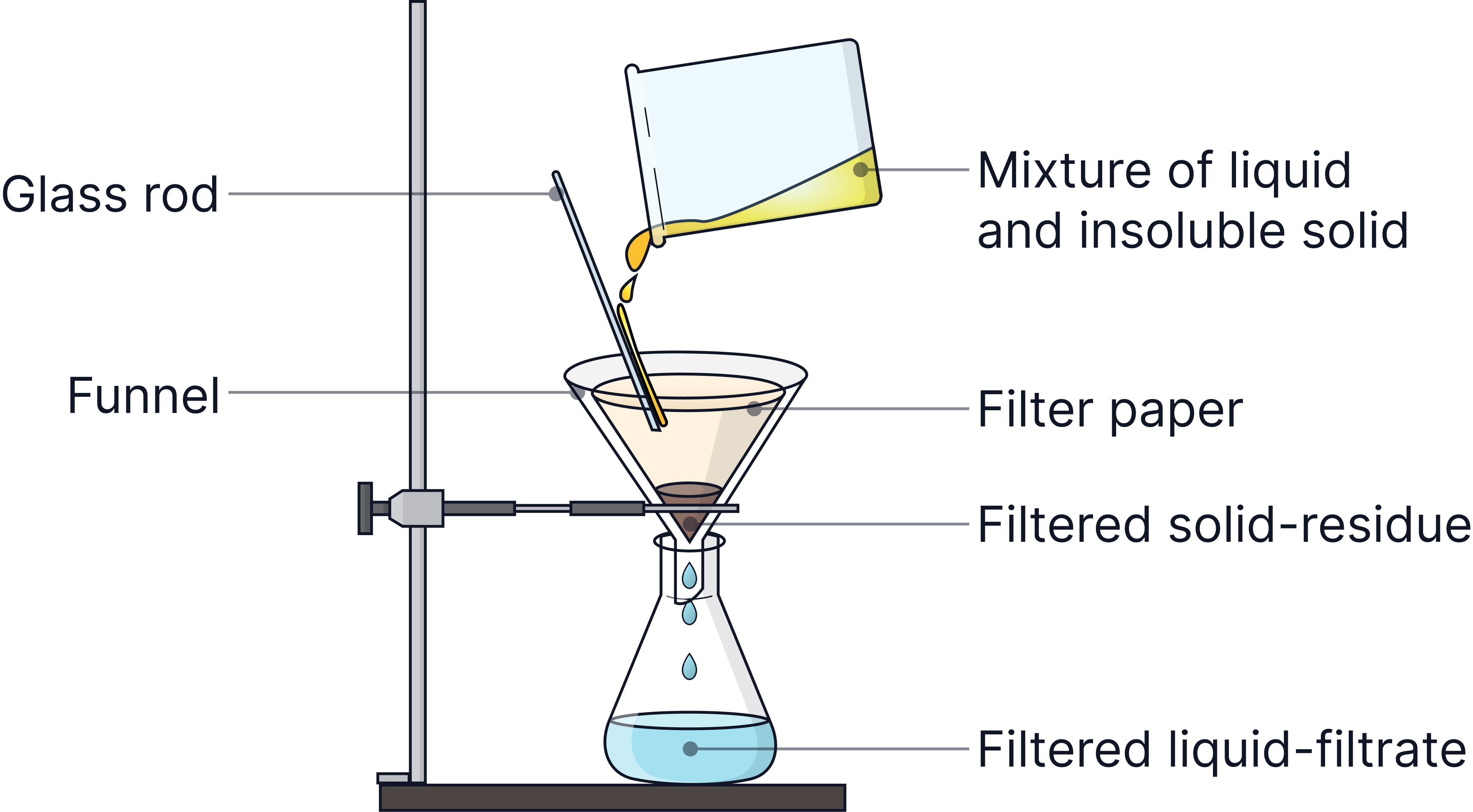 Filtration | Insoluble solid from a liquid | The solid cannot pass through the filter paper | Sand from water |