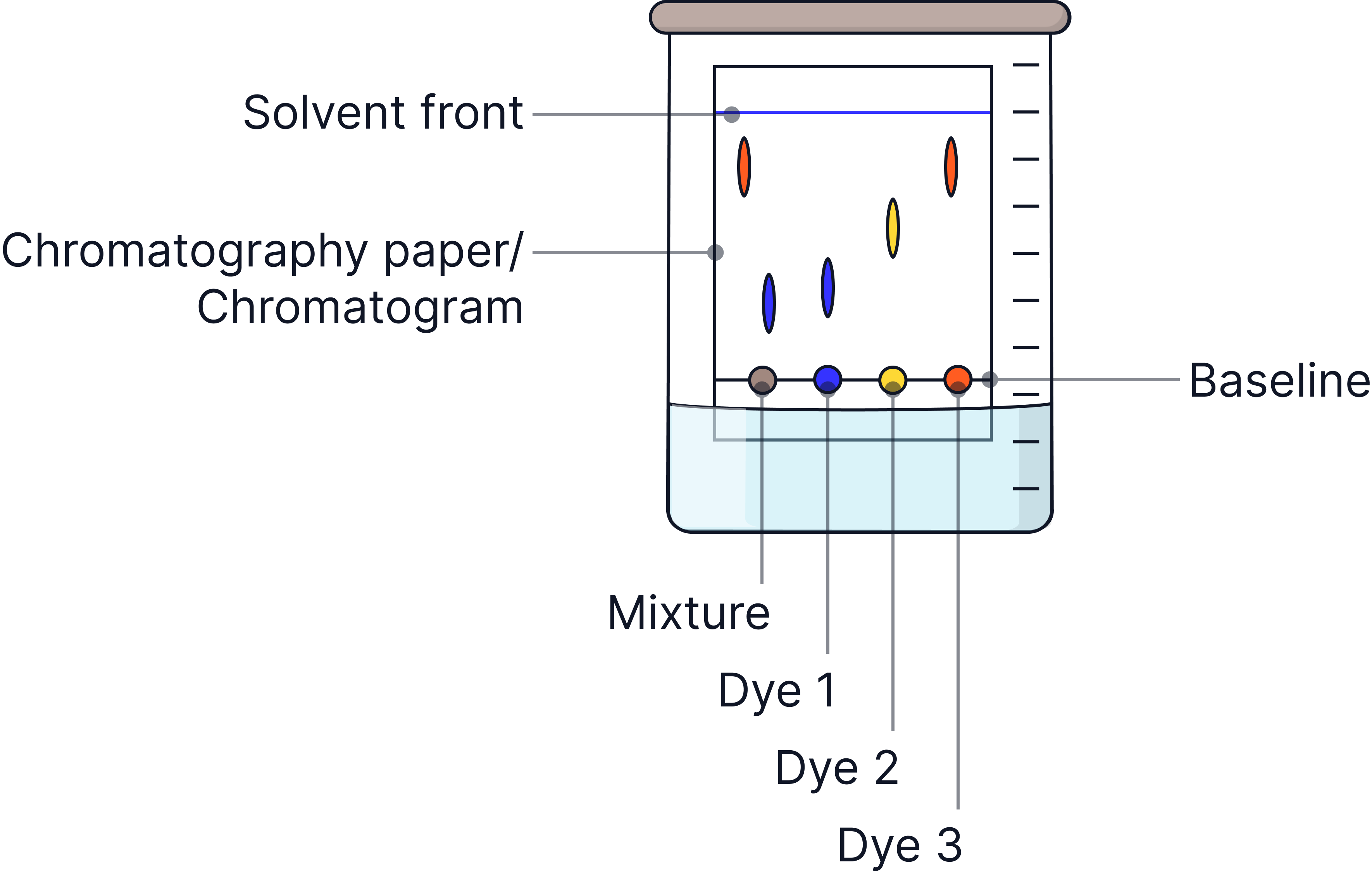 Chromatography | Substances dissolved in a solvent (e.g. dyes, inks) | Different substances move at different speeds through the stationary phase.