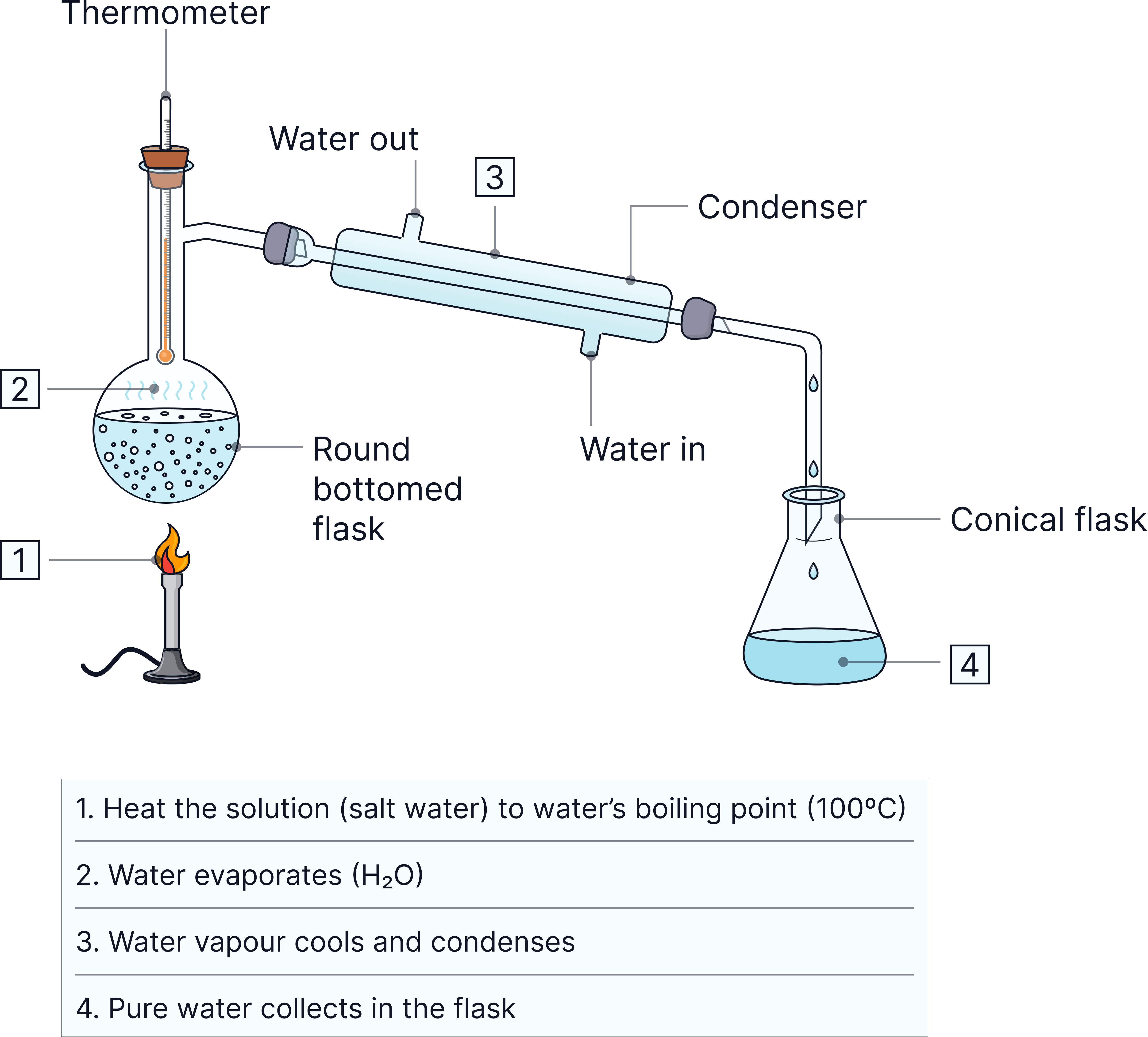 1. Distillation – heat seawater so water evaporates, then condense to collect pure water.