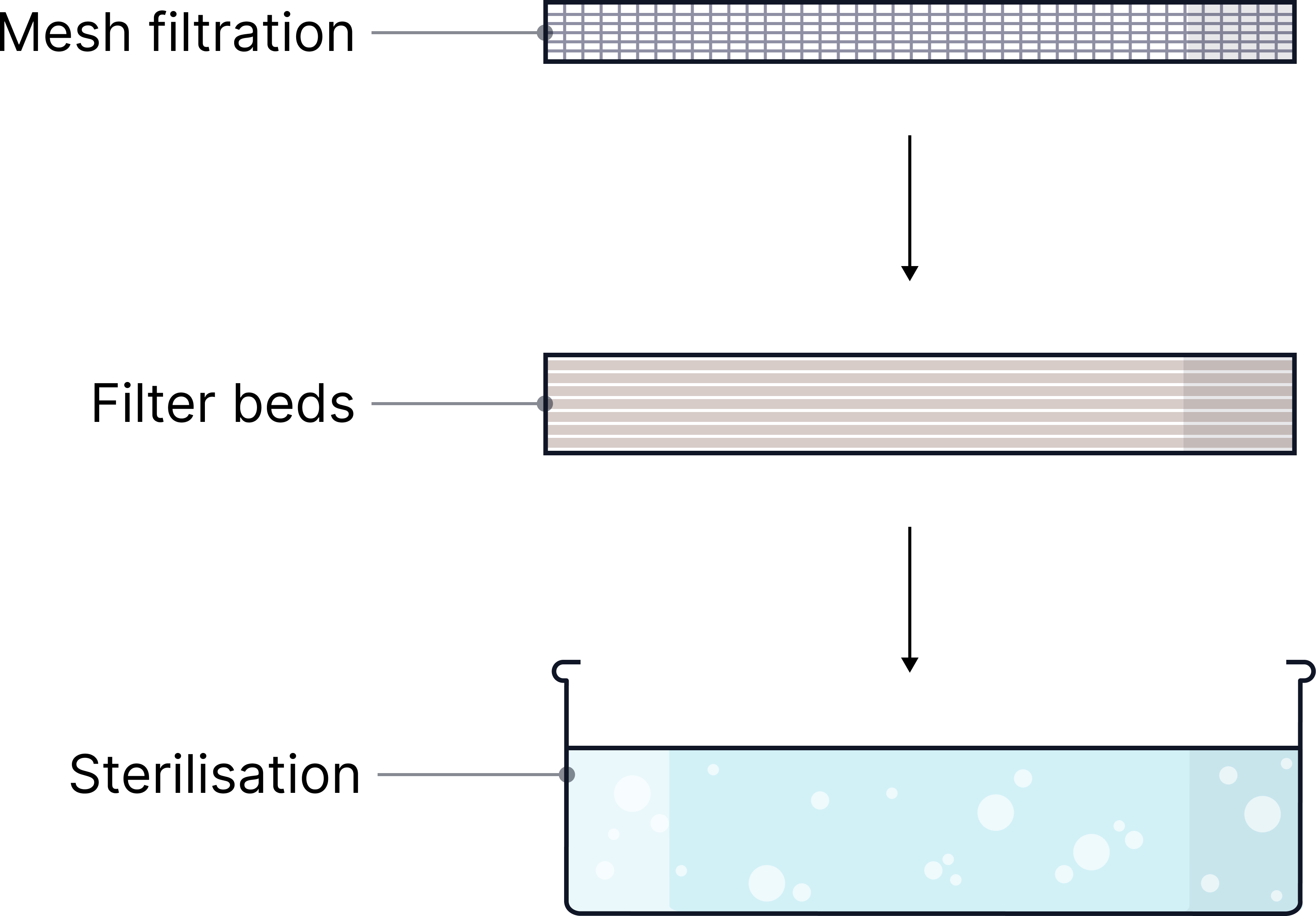 - Water is passed through mesh, then sand and gravel filters.