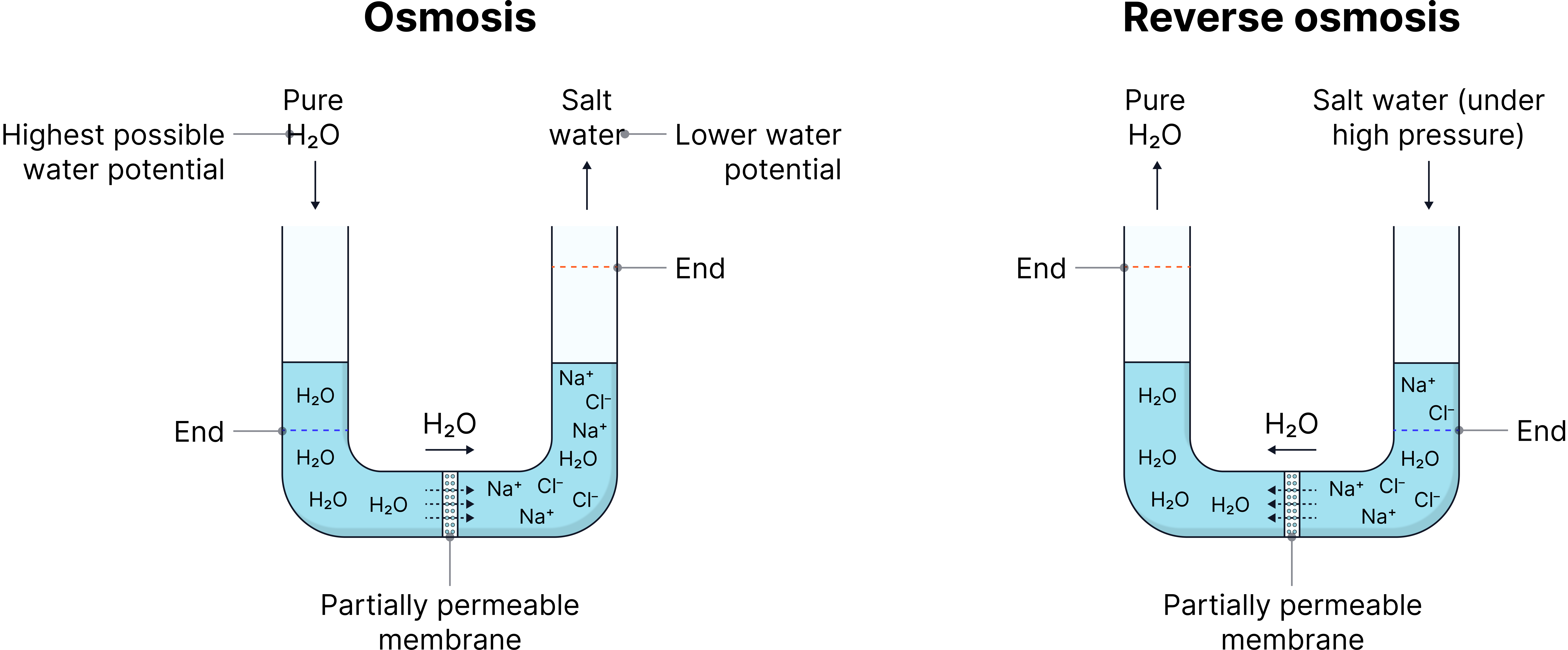 h) Compare the process of reverse osmosis used in desalination with osmosis in living cells.