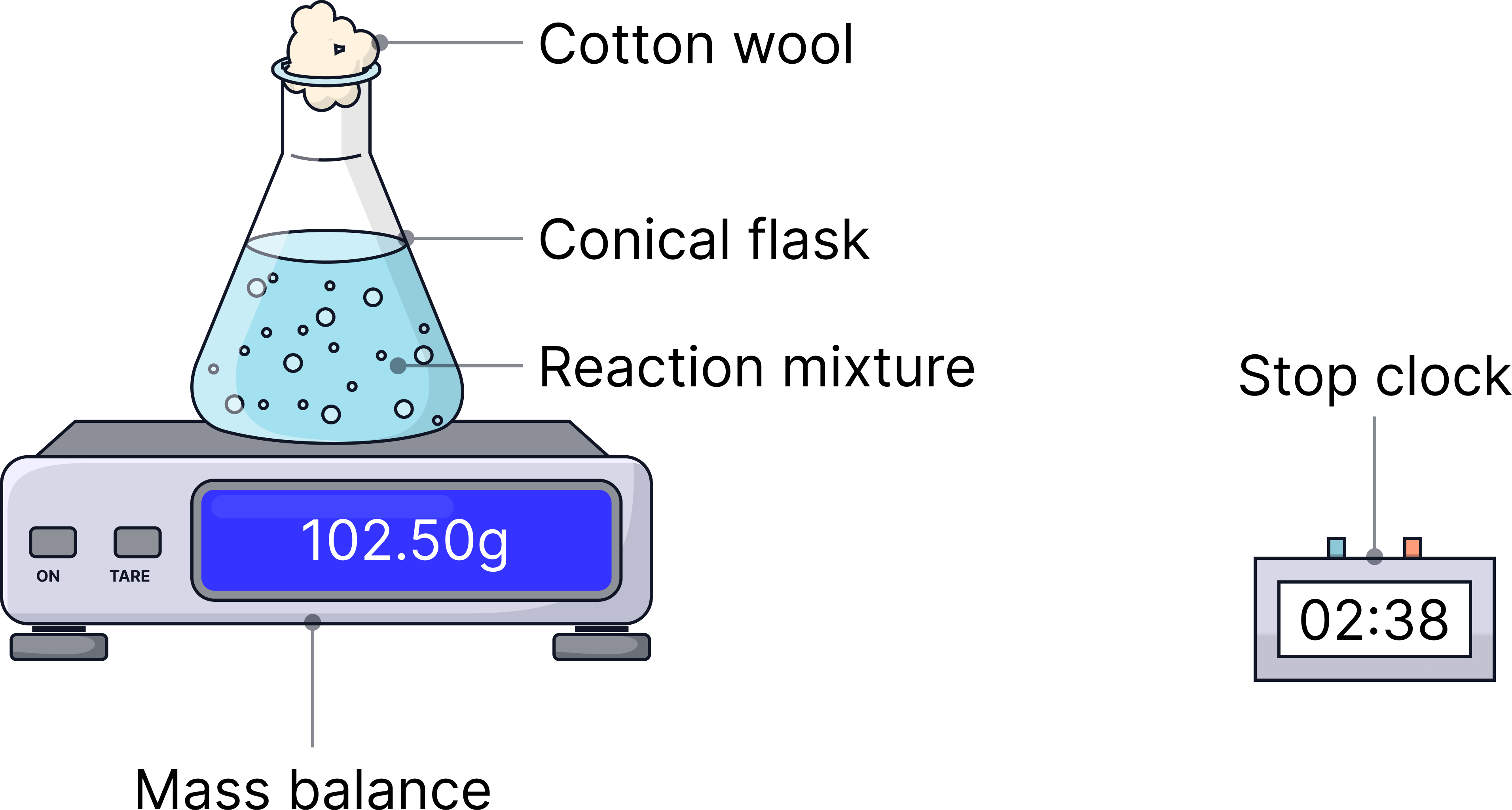 Dependent variable | Mass of reaction mixture over time | Measured every 30 s as CO₂ escapes from the flask. |