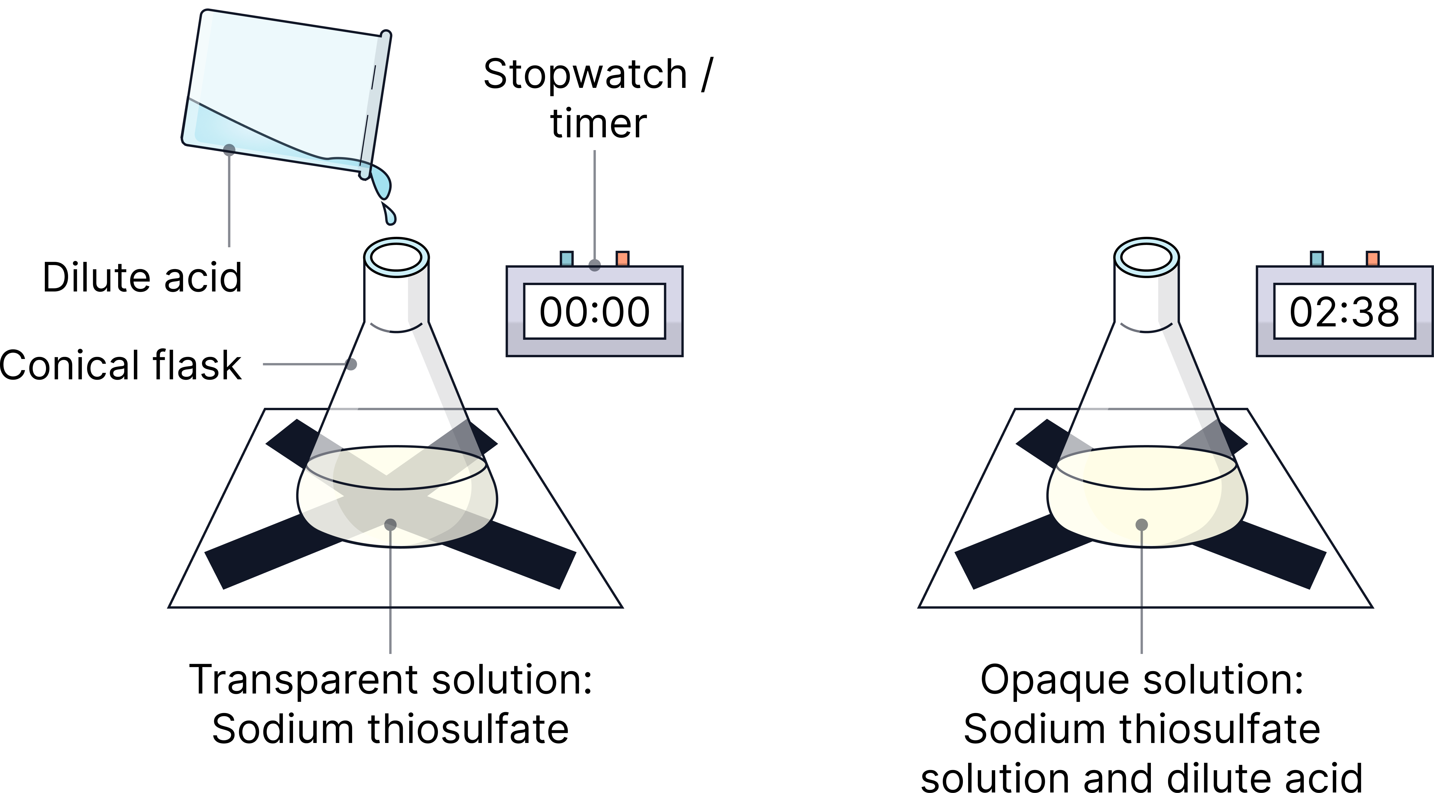 5) Repeat with higher concentrations of sodium thiosulphate (0.2, 0.3, 0.4 and 0.5 mol/dm³)