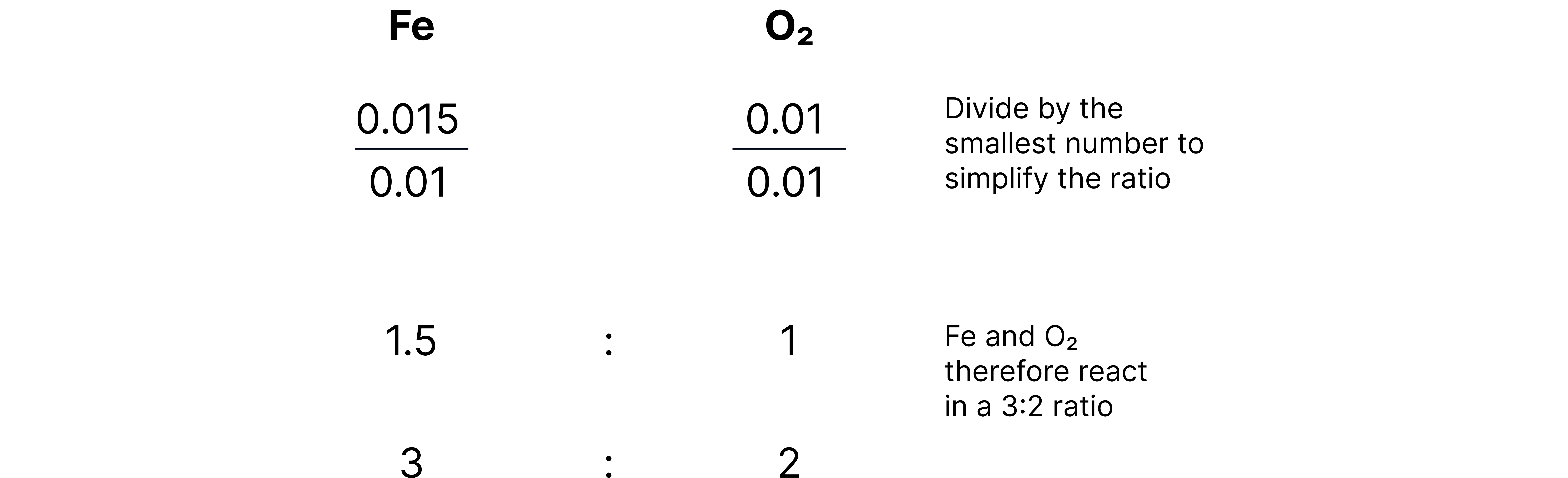 0.015 mol of iron reacts with 0.01 mol of oxygen gas. Determine the formula of iron oxide made and give a balanced symbol equation for the reaction.