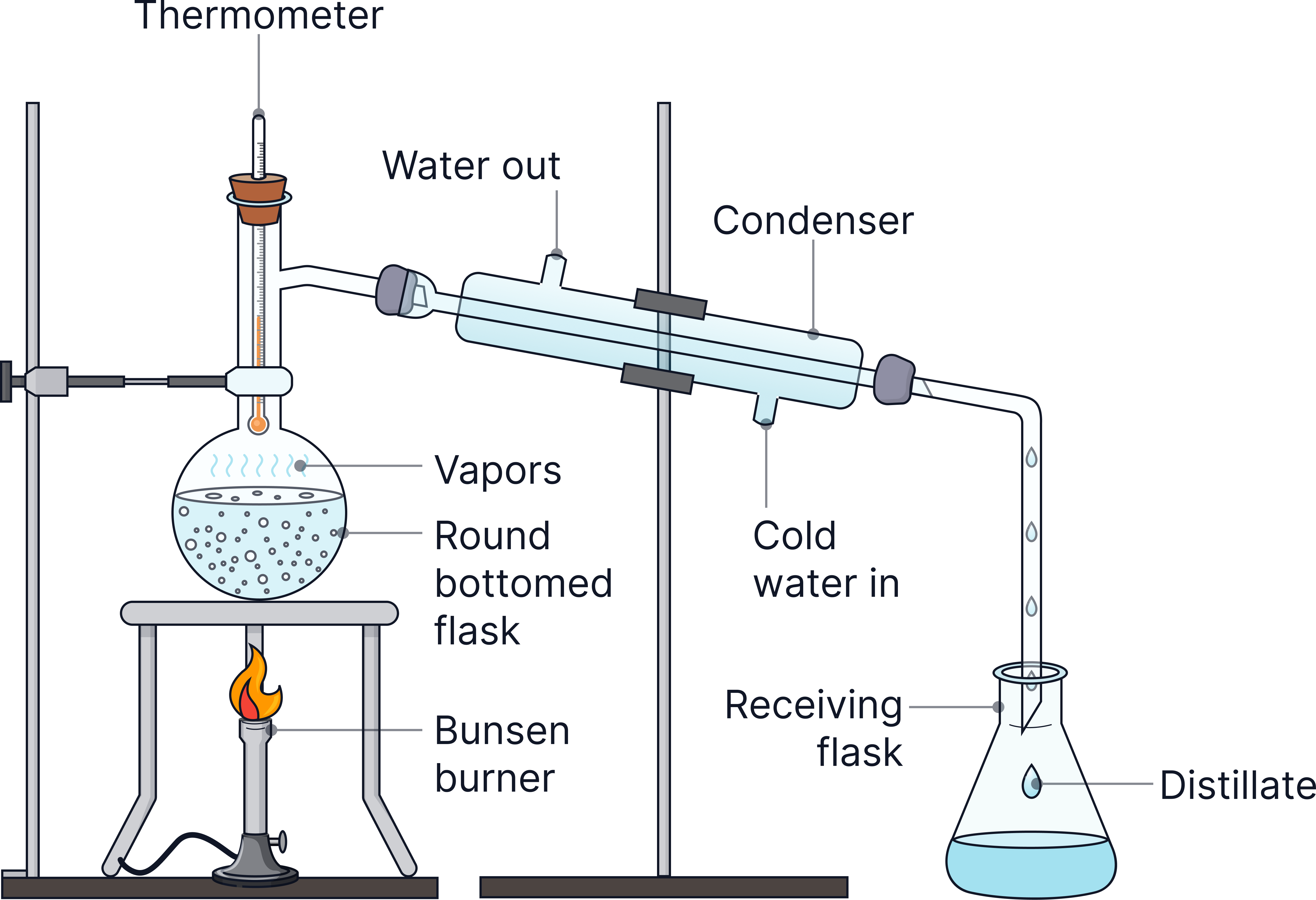 c) Distillation removes impure solids because the water boils and evaporates, leaving the dissolved solids behind. The steam is then condensed back into pure liquid water, so the solids do not transfer into the distillate.