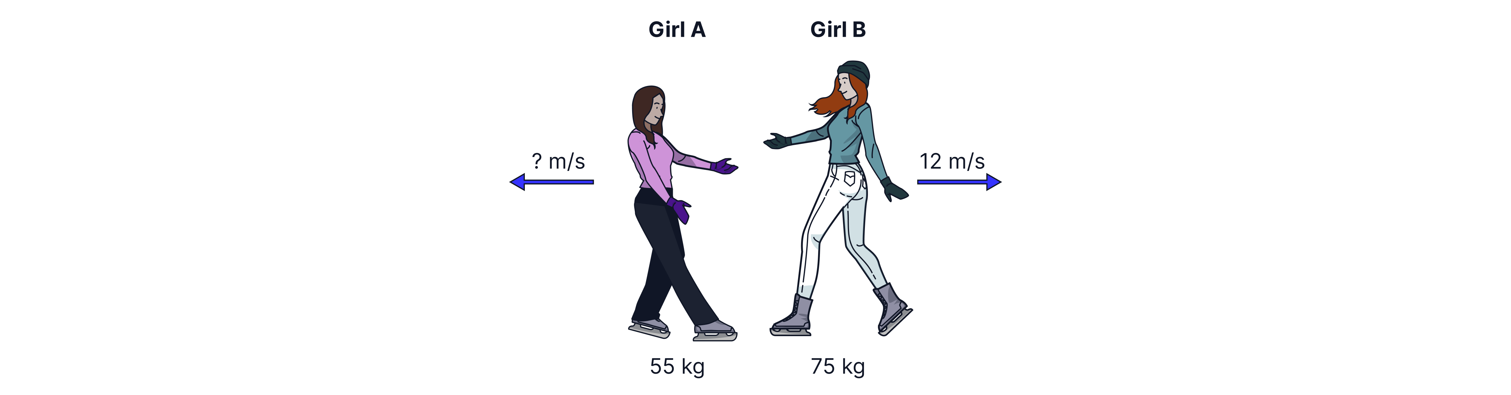 Example: imagine two ice skaters, Girl A and Girl B. If the girls are stationary and then push off each other, they move in opposite directions - this would count as an "explosion". Girl A has a mass of and girl B has a mass of . If Girl B moves to the right at , we can calculate girl A's velocity using the law of conservation of momentum: