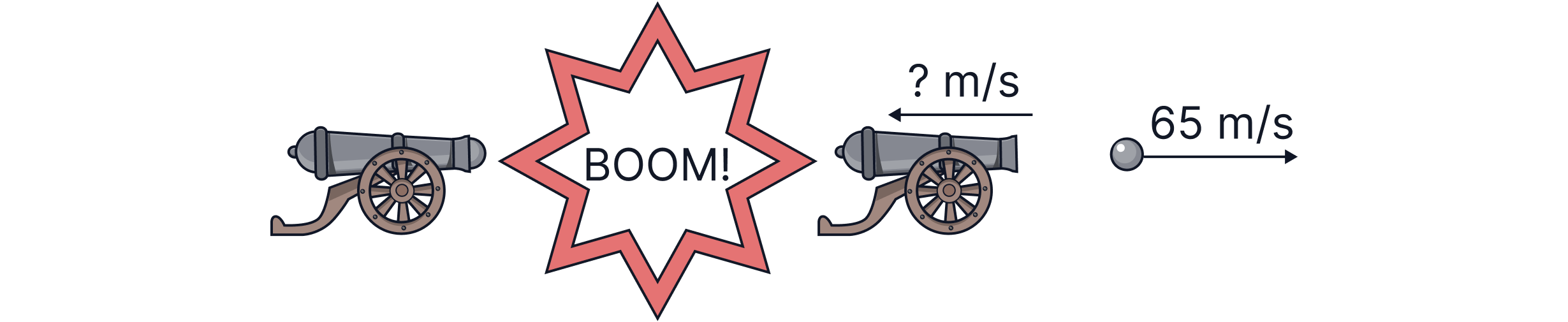 The velocity of the cannon is negative, telling us that it moves in the opposite direction to the cannonball. If the cannonball moves forward, the cannon must be moving backwards, or to the left, as it has a negative sign. This is called recoil.