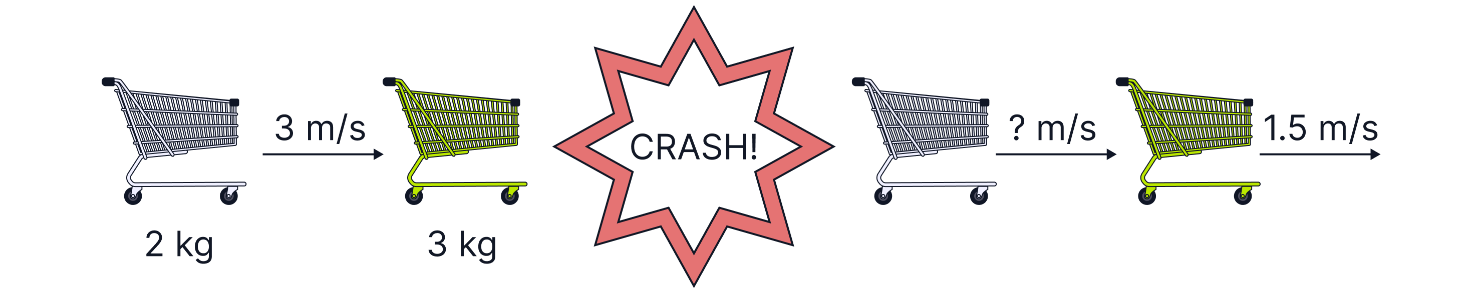 First we need to calculate the total momentum before the collision. The total of teh momentum of the silver cart and the green cart, . Because the green cart is stationary, its momentum before is zero.