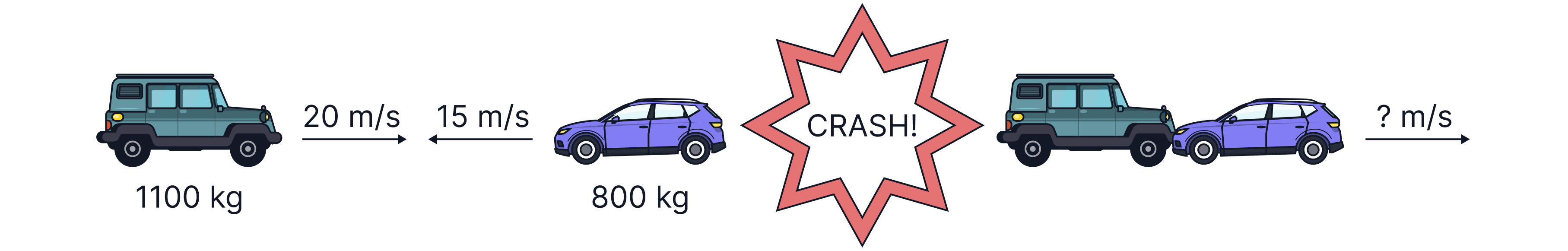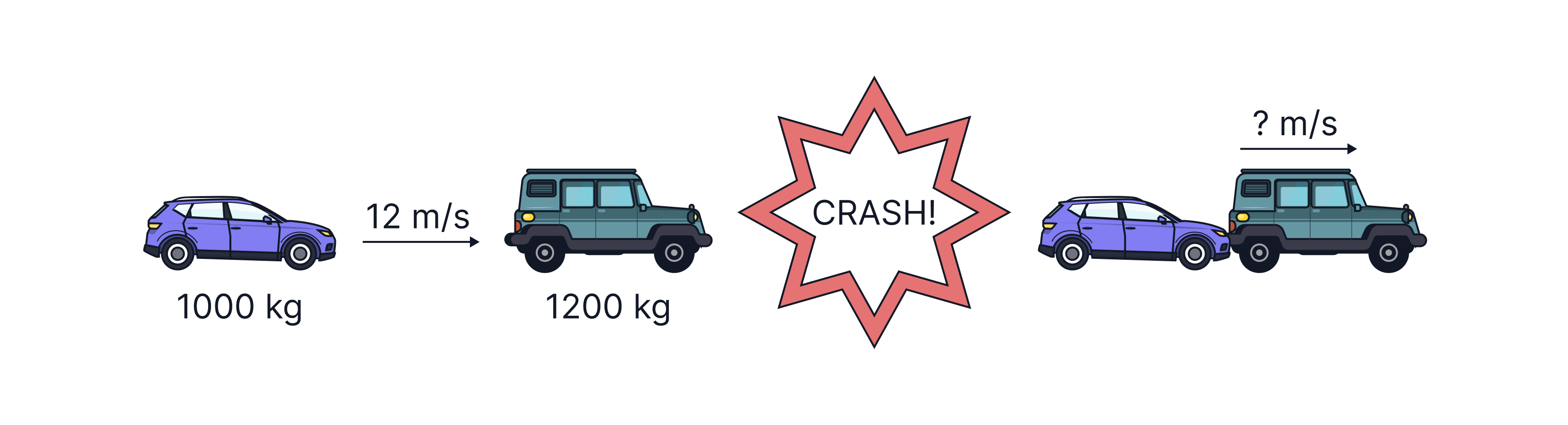 Example: A car with mass of skids on ice at a velocity of colliding with a stationary car of mass . They stick together and move off together. We can use conservation of momentum to calculate the speed of the cars after the collision.