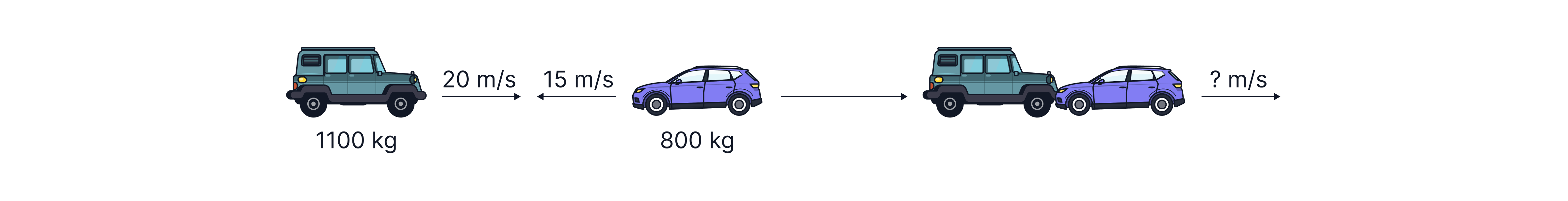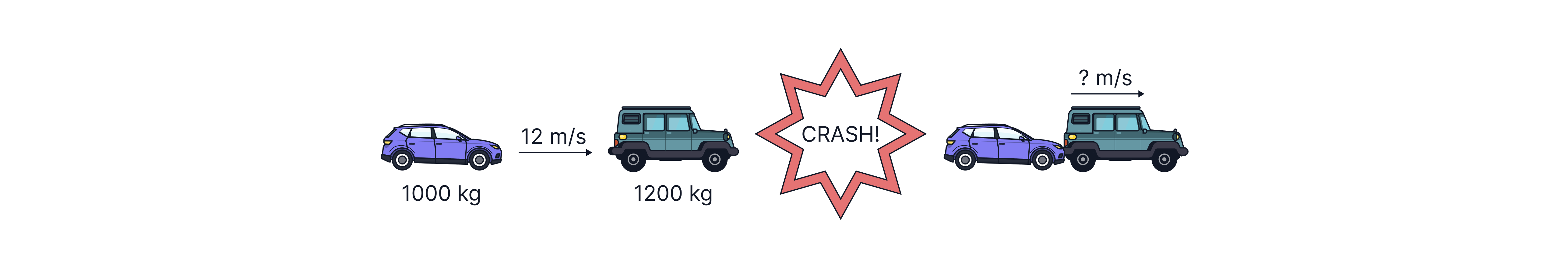 Example: a car with mass of skids on ice at a velocity of , collides with a stationary car of mass and they stick together and move off. If we assume that this collision happens in a closed system (no external forces so no friction), we can work out the speed at which the cars move using conservation of momentum: