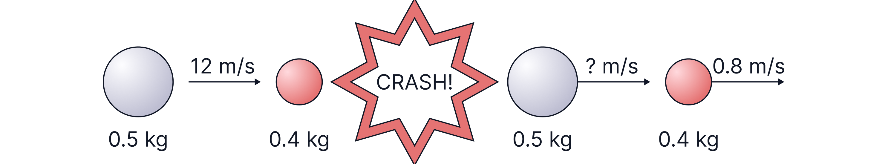 Example: On a pool table, the white ball, mass of , is moving at and collides with a stationary red ball, mass . After the collision the red ball moves off at . We can use conservation of momentum to calculate the white ball's speed after the collision.