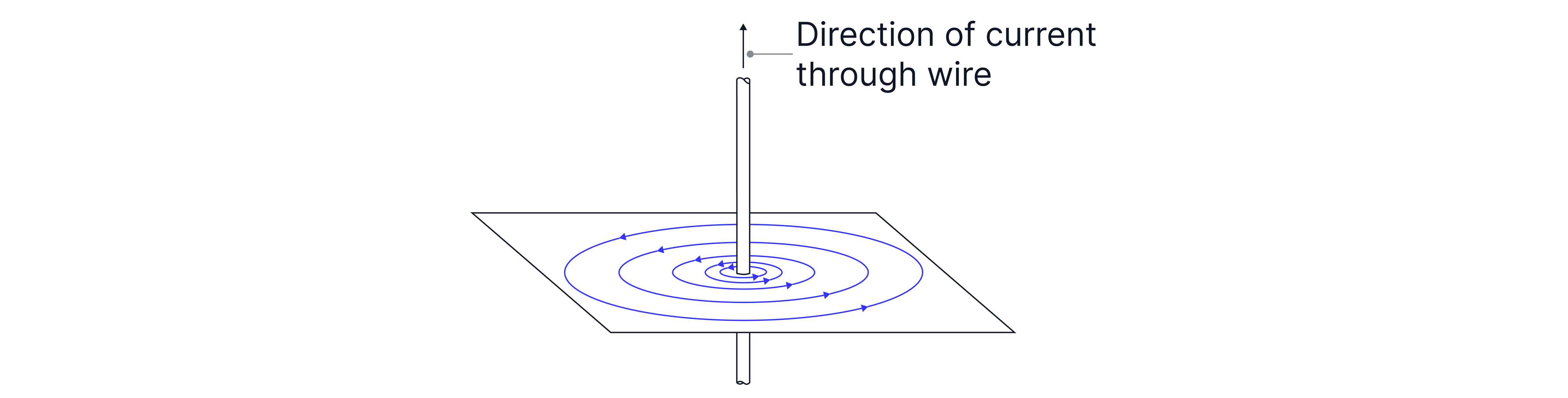 The magnetic field lines around a wire are circular, and, as we can see in the image below, they are closer together closer to the wire, showing that the magnetic field is strongest closer to the wire and gets weaker farther away.