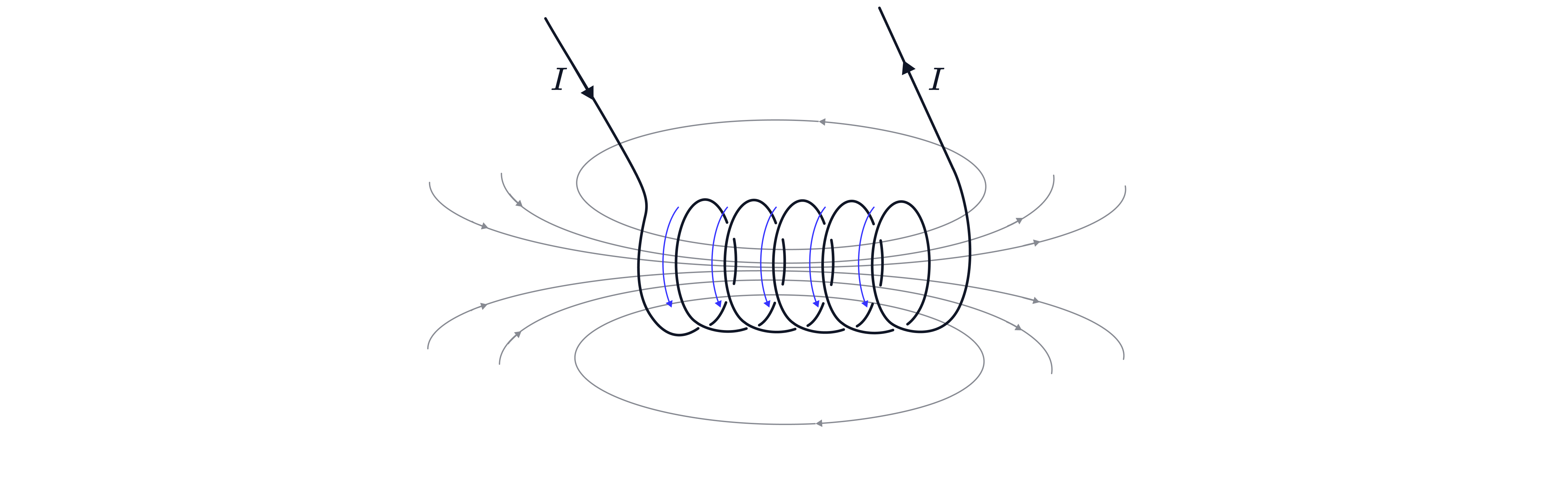 The magnetic field around a solenoid is like that of a bar magnet, as shown below. The magnetic field lines come out of the right-hand side, so this is the North pole of the solenoid, and the other end is the South pole.