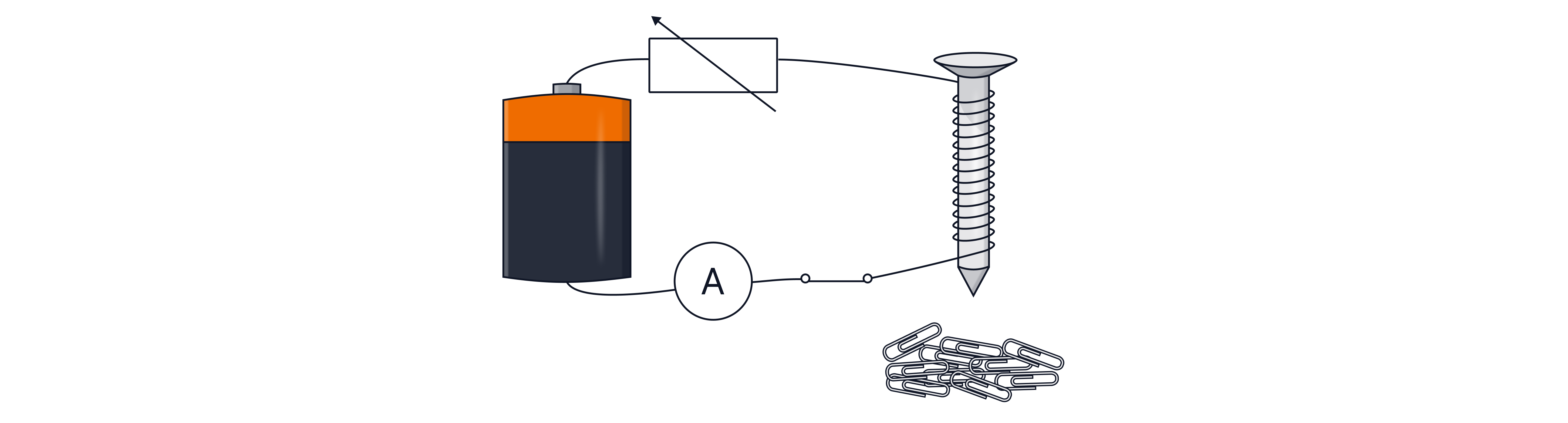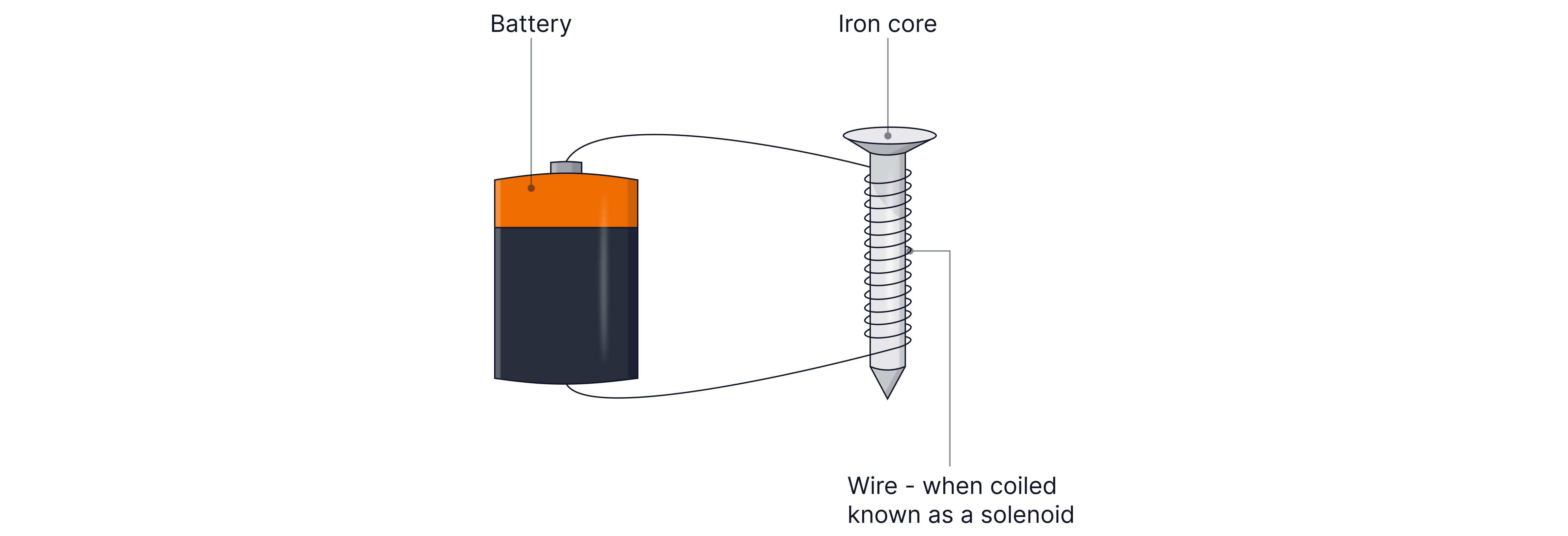 Remember: The cell provides energy to the circuit, and the direction of current, , is the direction of conventional current. From positive (+) to negative (-). A switch can be added to the circuit to turn the electromagnet on and off by cutting the flow of current.