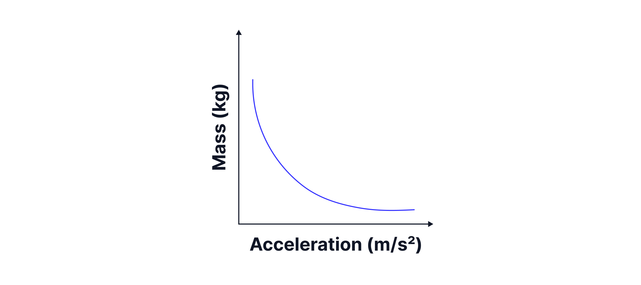 When a graph of mass against acceleration is plotted from our results, we get a graph like the one shown below. The curve shows that as the trolley's mass increases, its acceleration decreases. Mass and acceleration are inversely proportional.