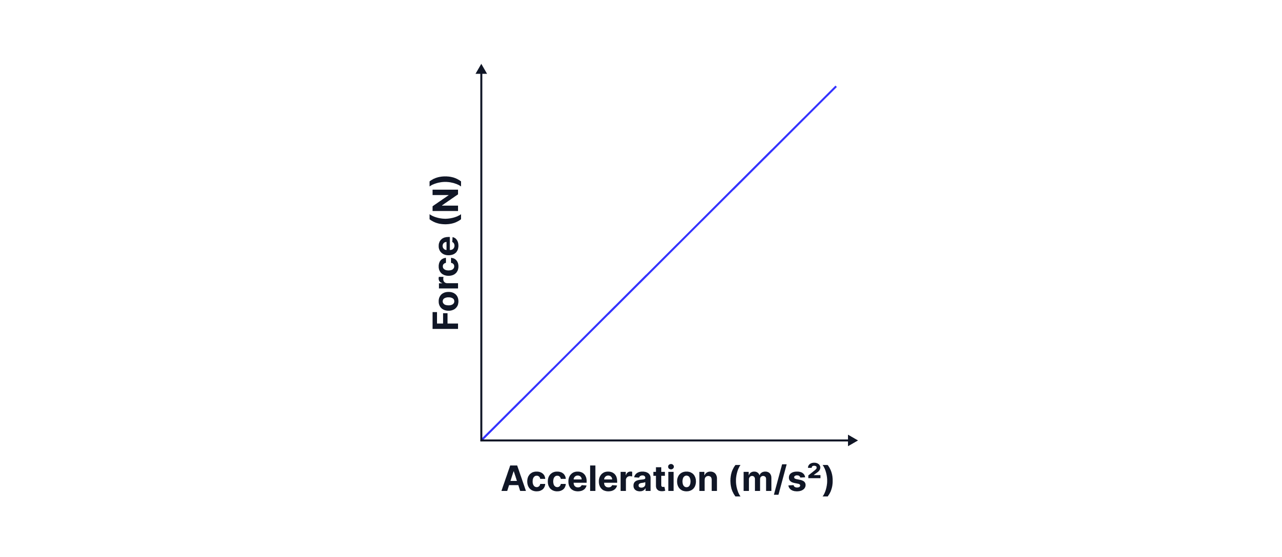 Plotting a graph of our results of force against acceleration, and drawing a line of best fit through our results, gives us a graph similar to the one below. The line of best fit passes straight through the origin, showing that force and acceleration are directly proportional, .