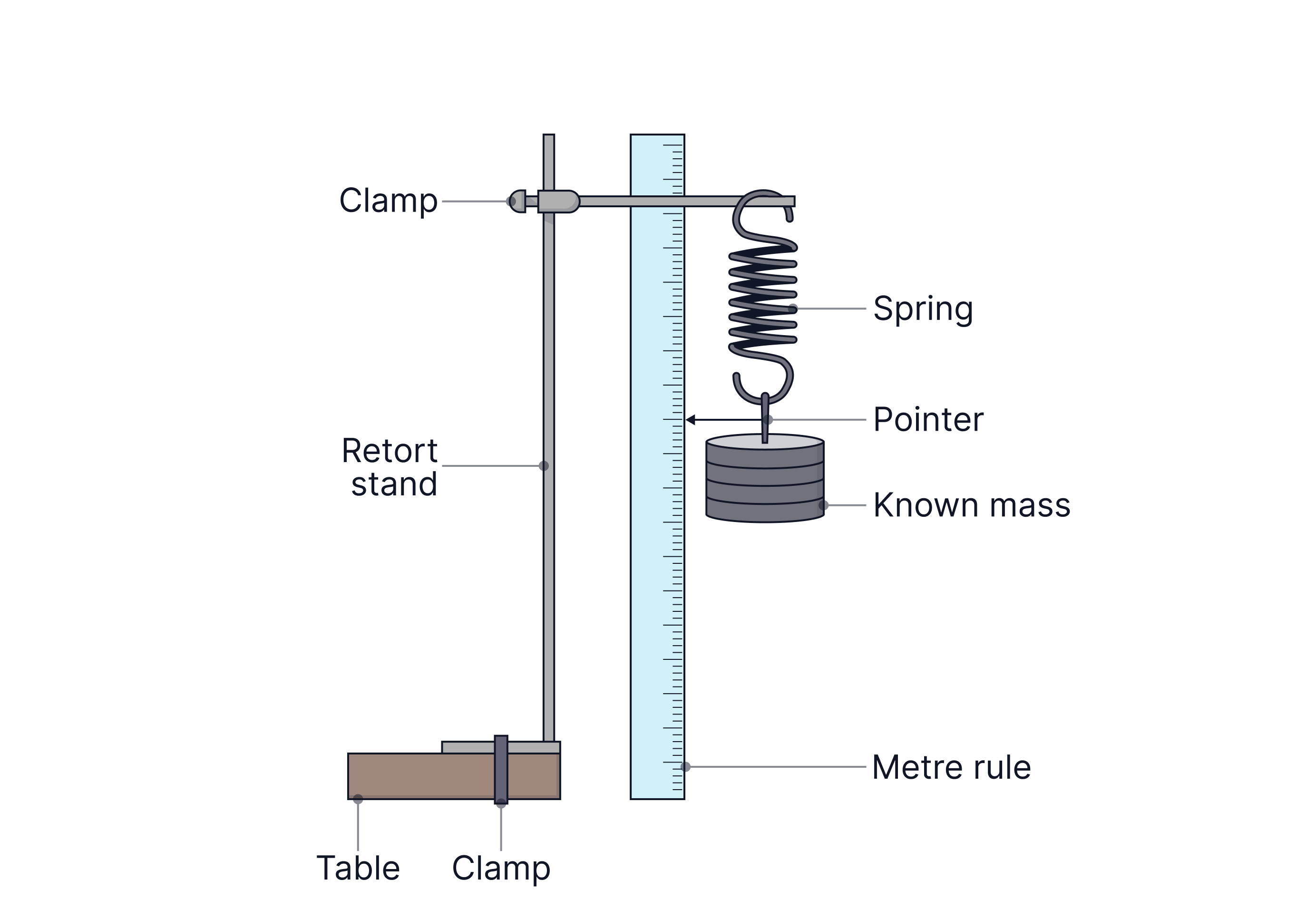Measure the new length of the spring using a ruler (ensure to read from the bottom of the spring, from the pointer, at eye level, to avoid parallax error)