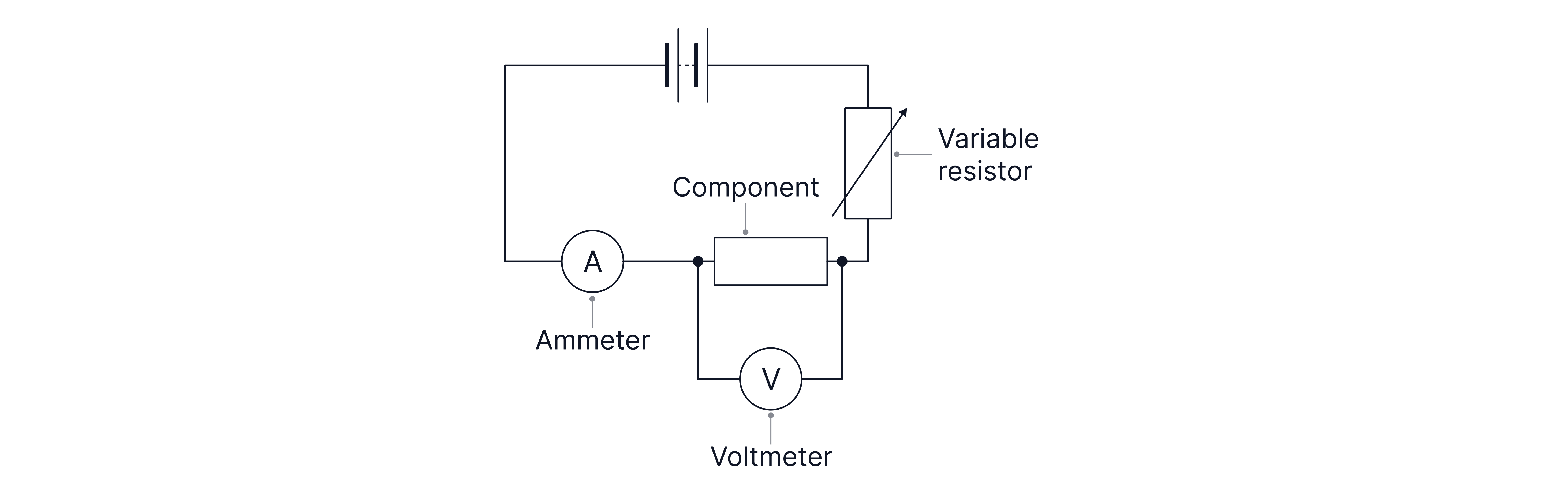 An characteristic graph tells us how the potential difference () across a component changes as we increase the current (). We can produce these graphs by making the circuit below and varying the current in the circuit by using the variable resistor (changes the resistance and thus the current, high resistance = low current). We record the reults and plot them in a graph.