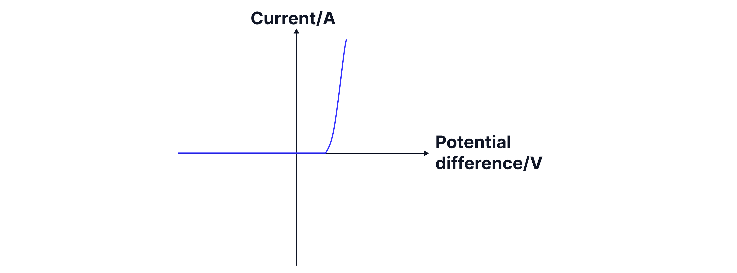 A diode only allows current to flow in one direction. For positive values of pd, current can flow through the diode, but when the pd is negative, when the connection to the cell have been reversed, no current flows, the current is . The diode will not allow current to flow in this direction as its resistance is high.