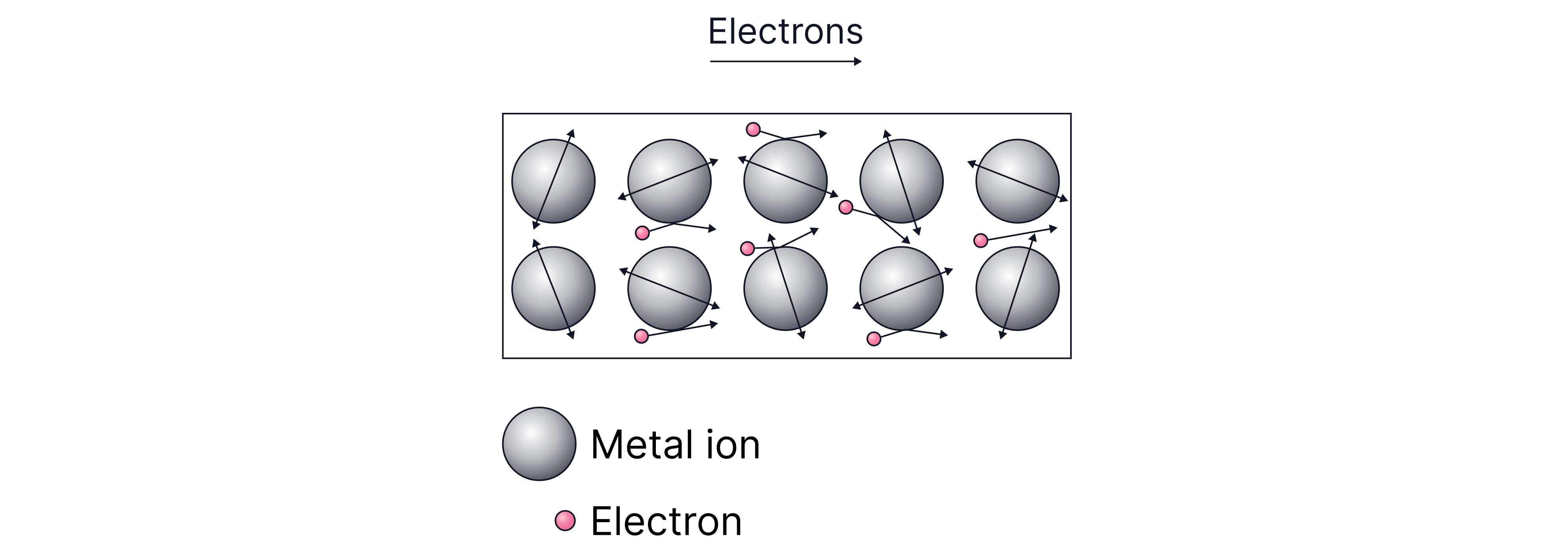 Resistance is the opposition to the flow of charge. It opposes the movement of electrons. As electrons try to move through the wire, they collide with metal ions. This is what resists or slows down the movement of the electrons. The longer the wire, the more metal ions that electrons collide with. When electrons collide with metal ions, they transfer thermal energy to the metal ions. This causes them to heat up and vibrate more, which also increases the resistance of the metal.
